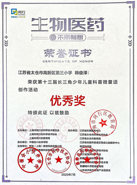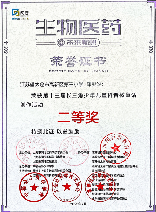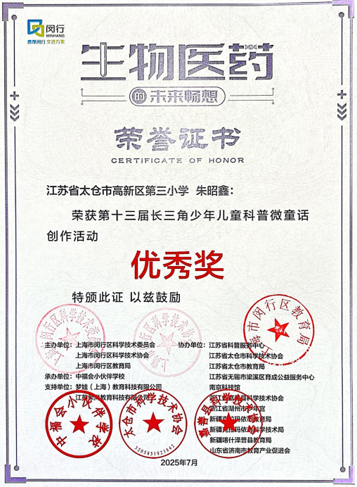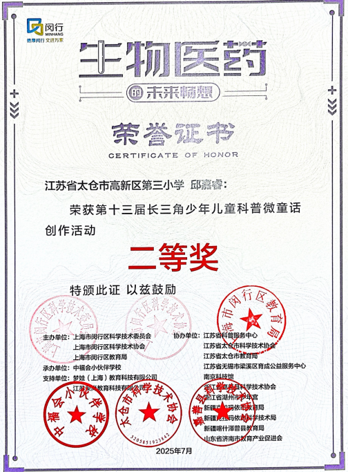 朱昭鑫、邱嘉睿、韩俊泽、邱樊汐同学在第十三届长三角少年儿童科普微童话创作活动中获奖。