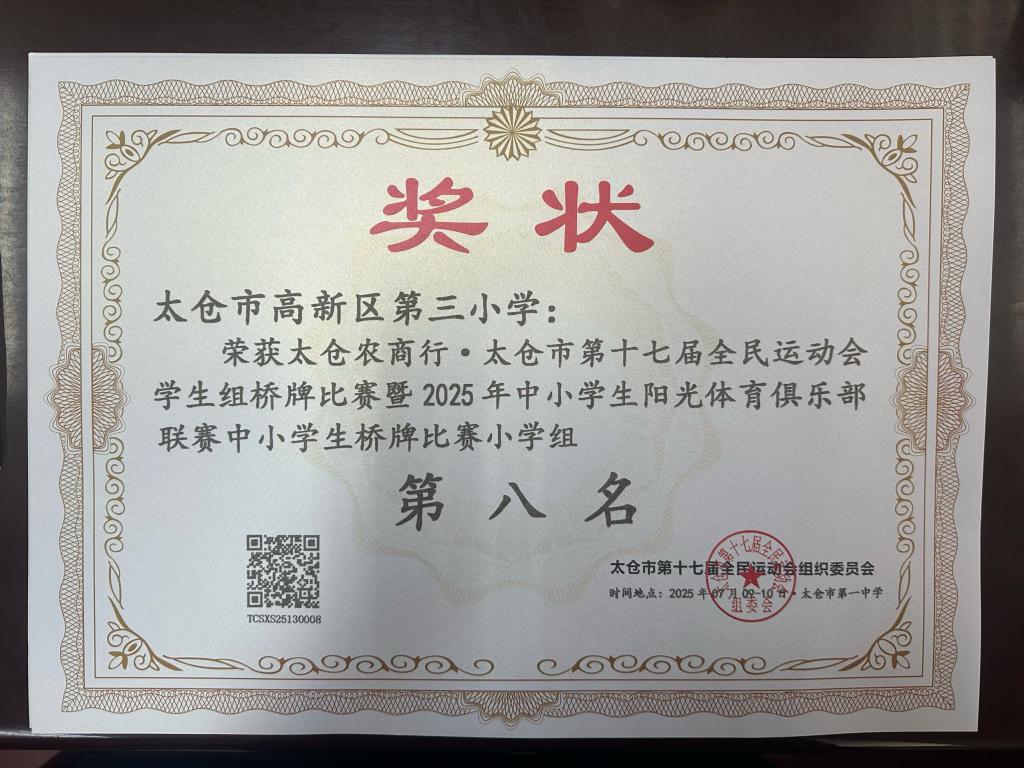 我校荣获太仓市农商行·太仓市第十七届全民运动会学生组桥牌比赛暨2025年中小学阳光体育俱乐部联赛中荣获第八名。