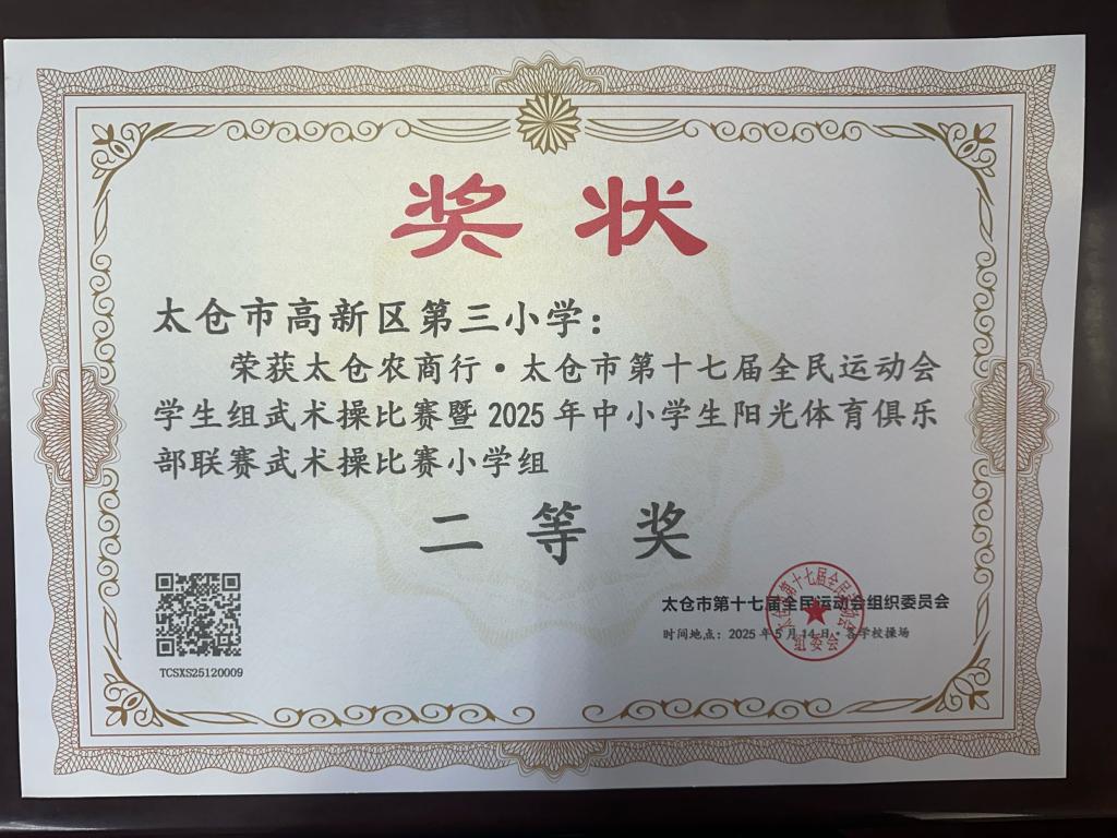 我校荣获太仓市农商行·太仓市第十七届全民运动会学生组桥牌比赛暨2025年中小学阳光体育俱乐部联赛中武术操比赛荣获二等奖。