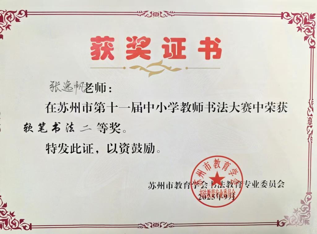 张逸帆老师在苏州市第十一届中小学教师书法大赛中荣获软笔书法二等奖。