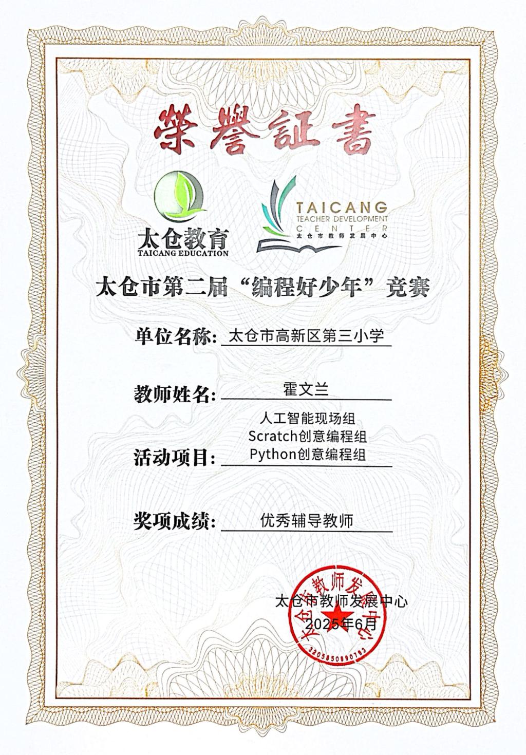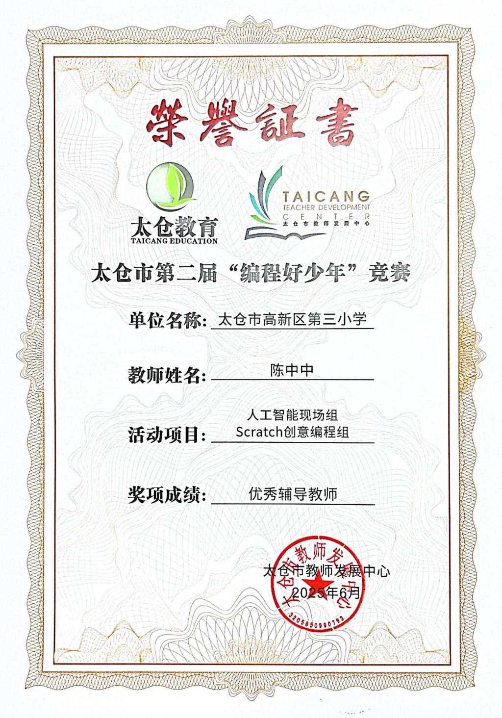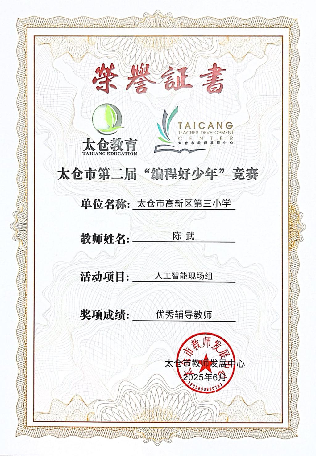 陈武、陈中中、霍文兰老师在太仓市第二届“编程好少年”竞赛人工智能现场组荣获优秀辅导教师