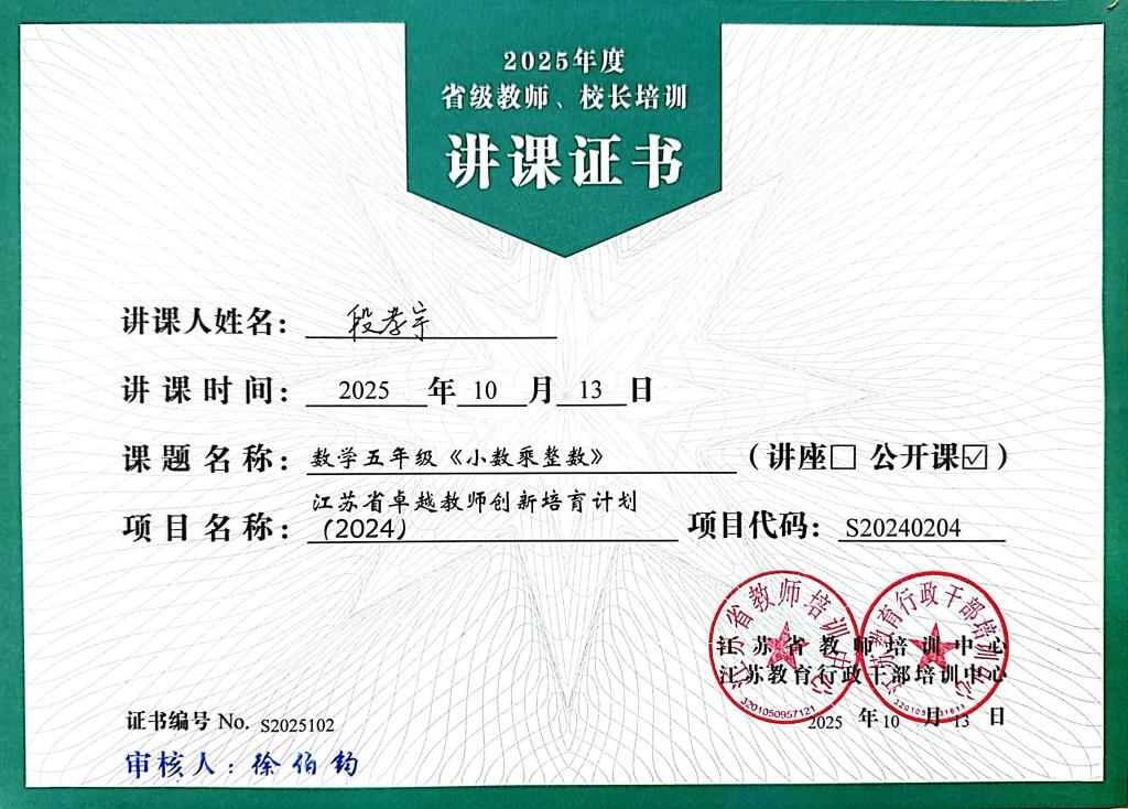 段孝宇老师开设了江苏省卓越教师创新培育计划小学五年级《小数乘整数》的公开课。