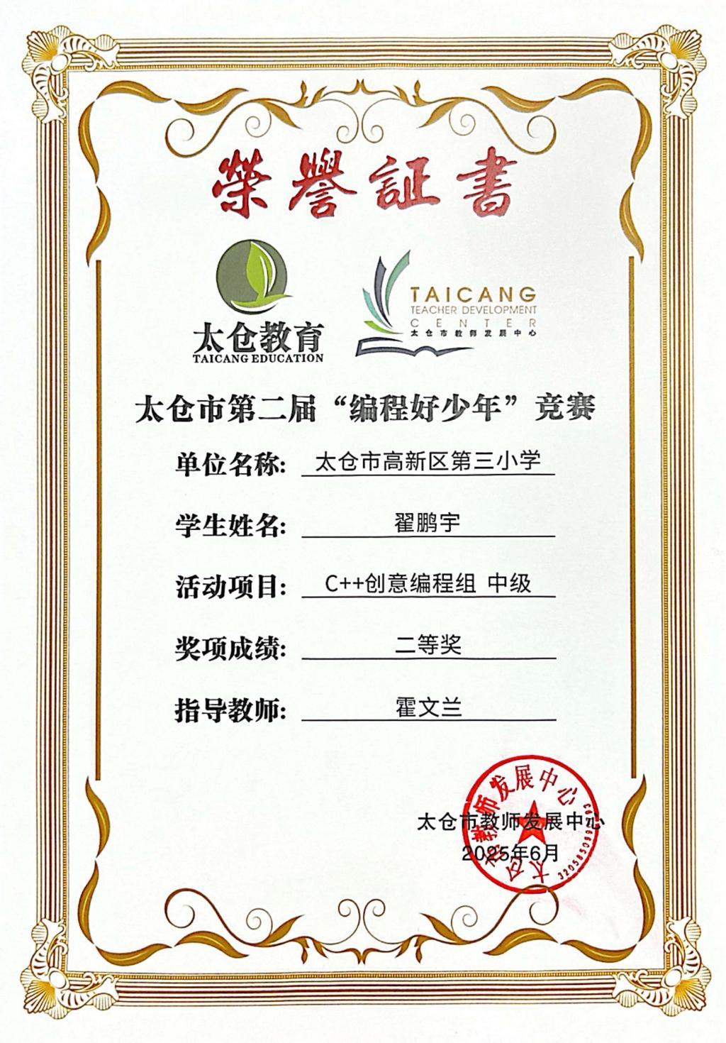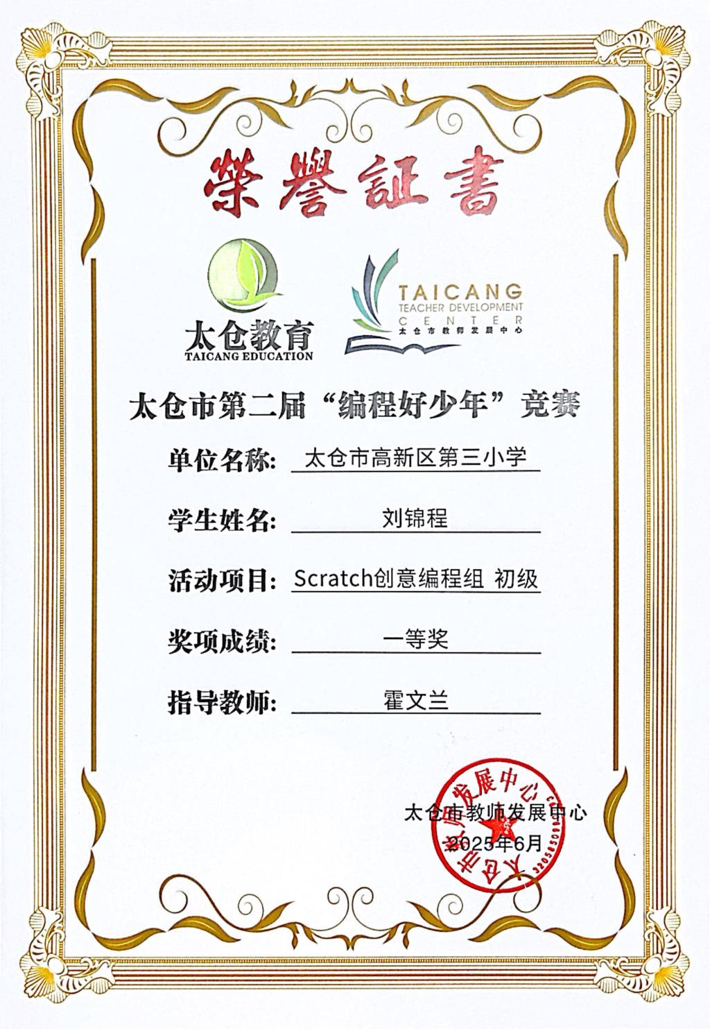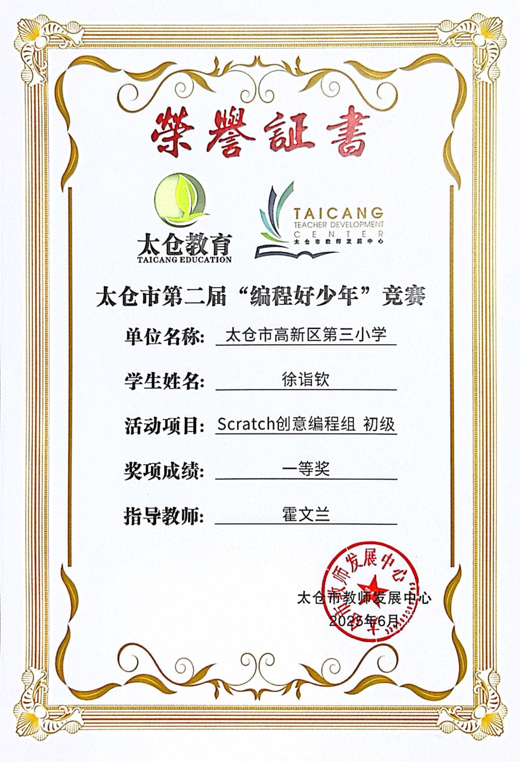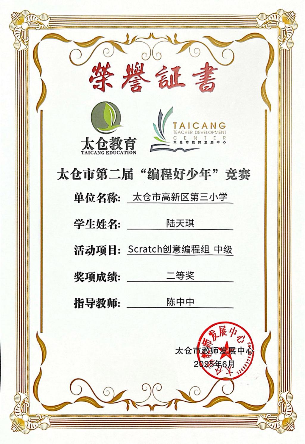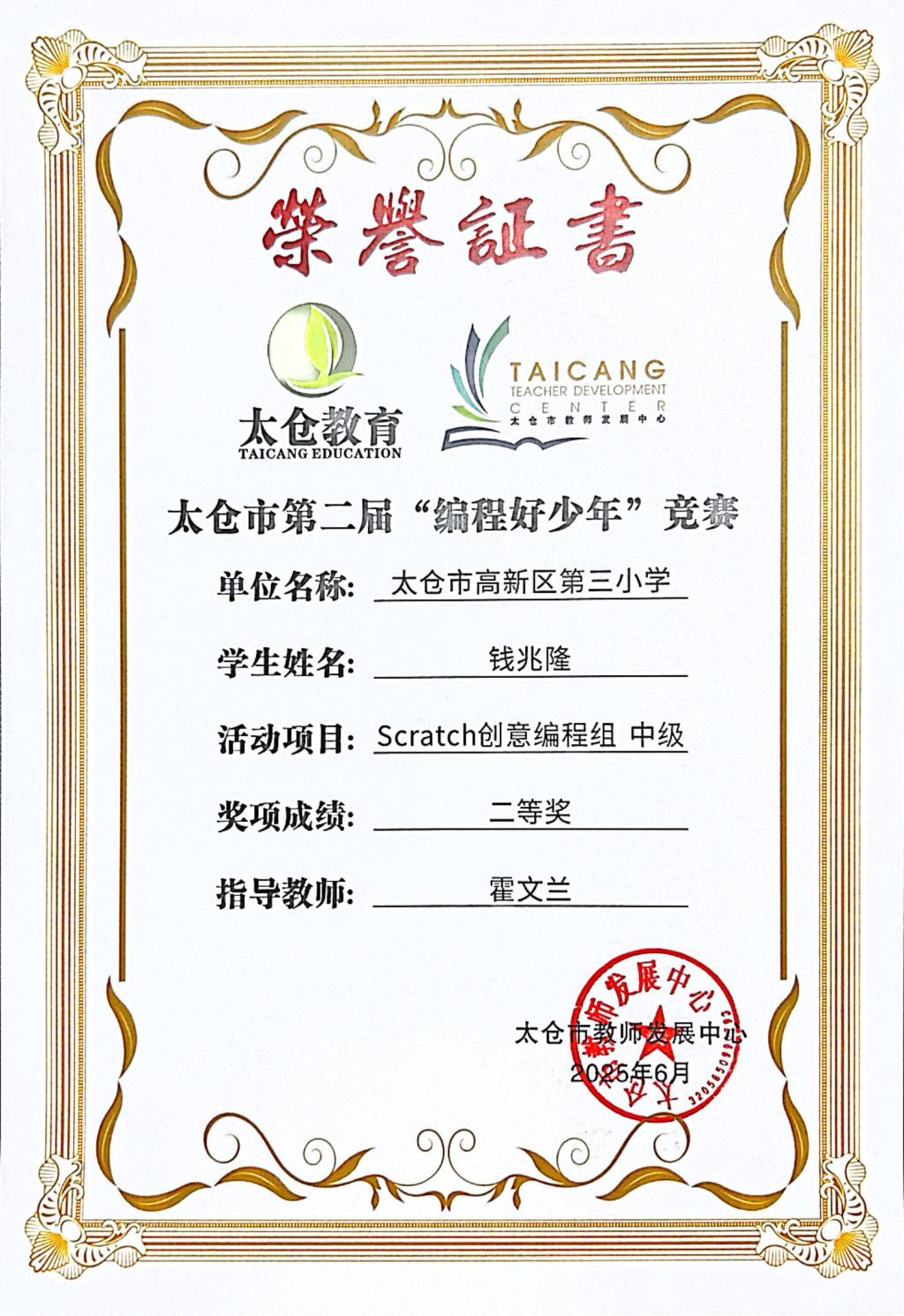 段逸兴、王笑、陈迦美、陈浩睿、凌启宸、刘夏叡、李宥禛、杜铭洋、祁可欣、朱辰悦、李依诺等同学在太仓市第二届“编程好少年”活动中获奖。