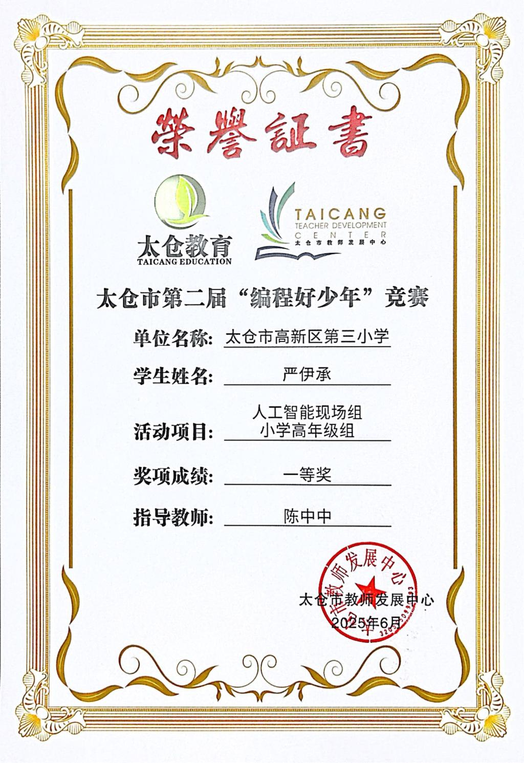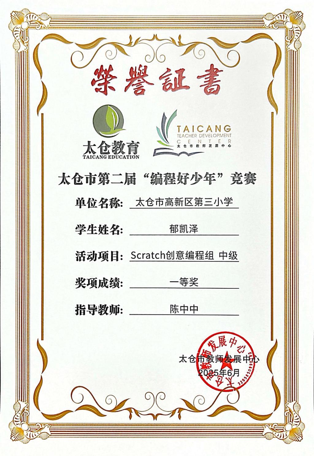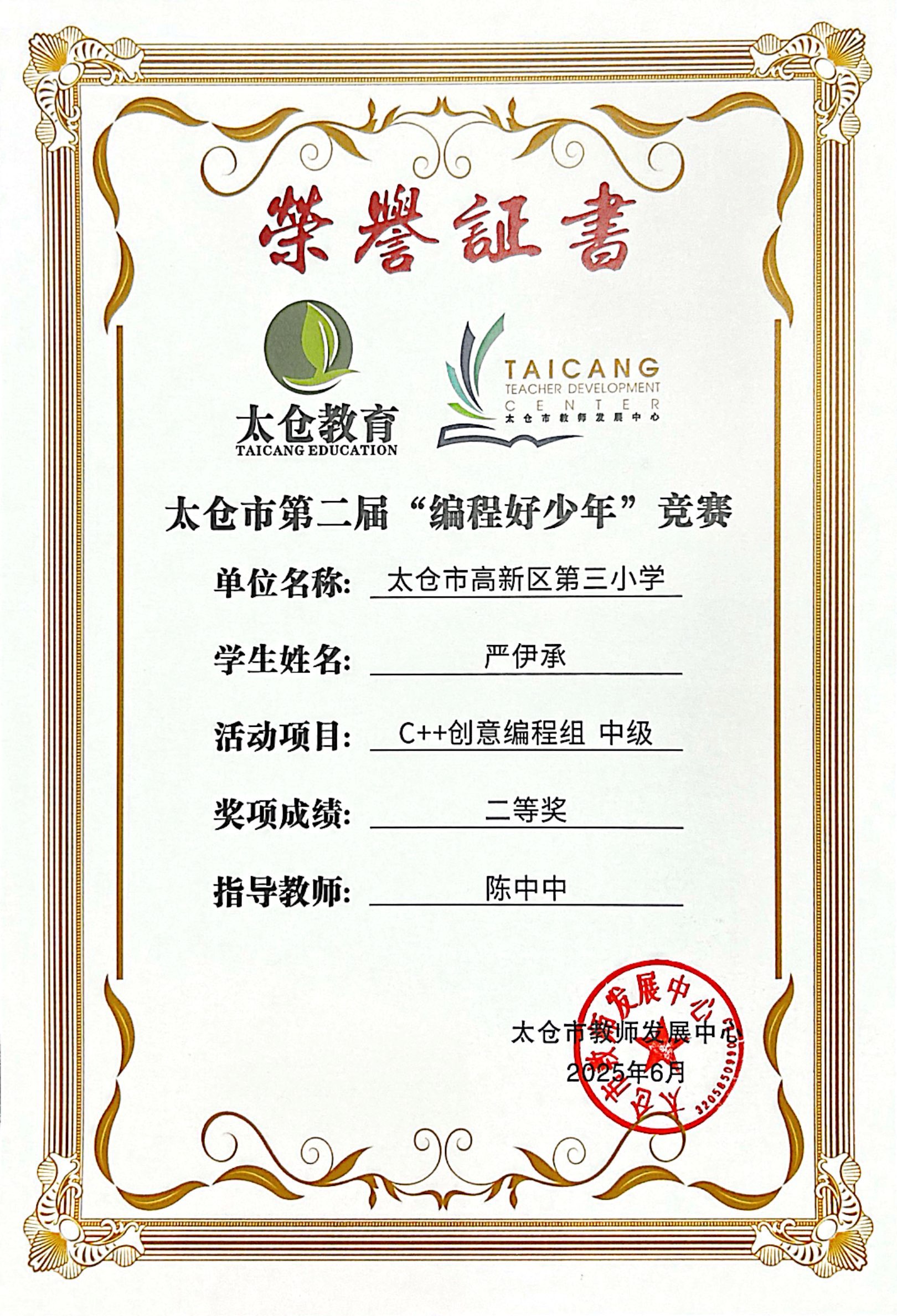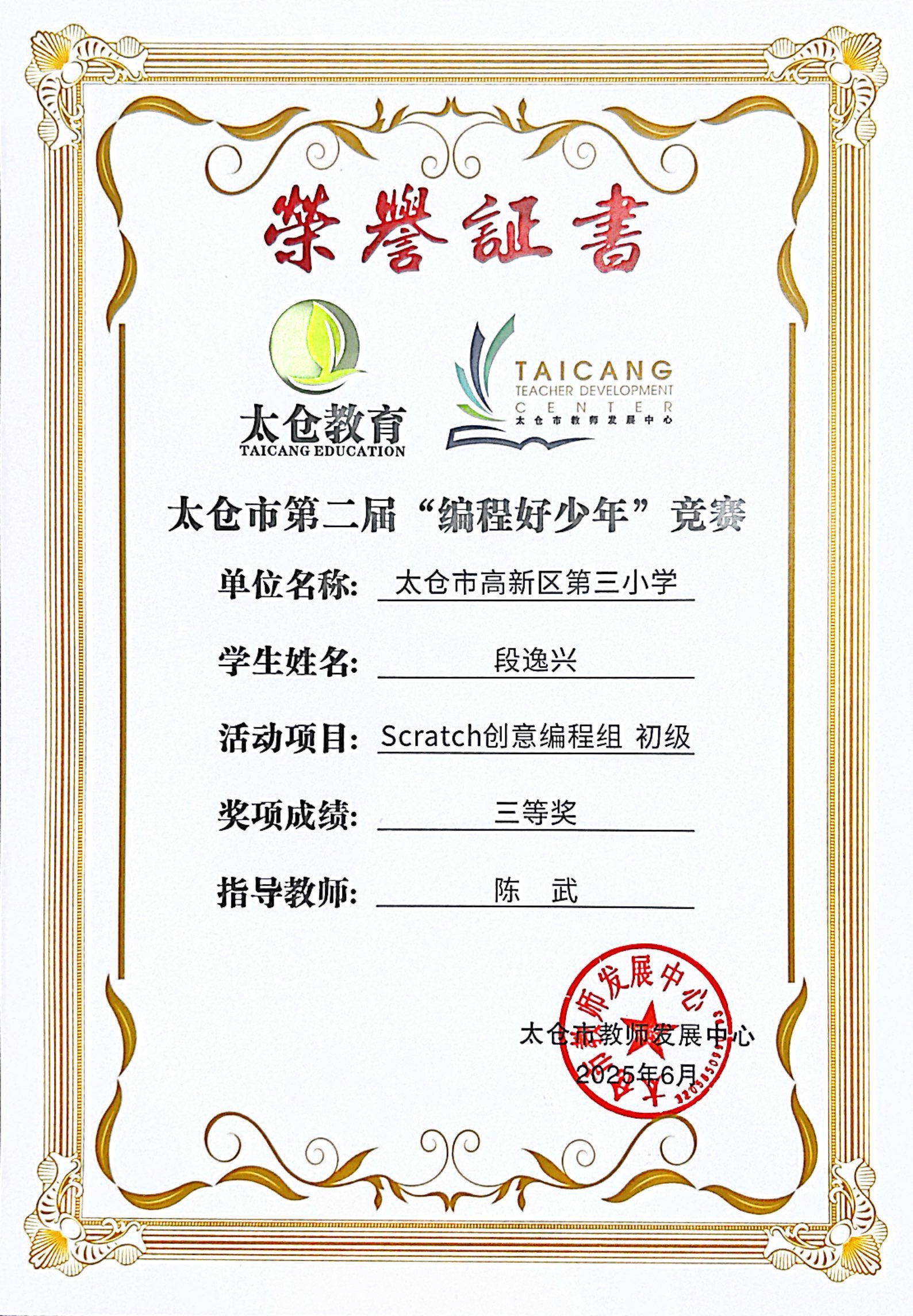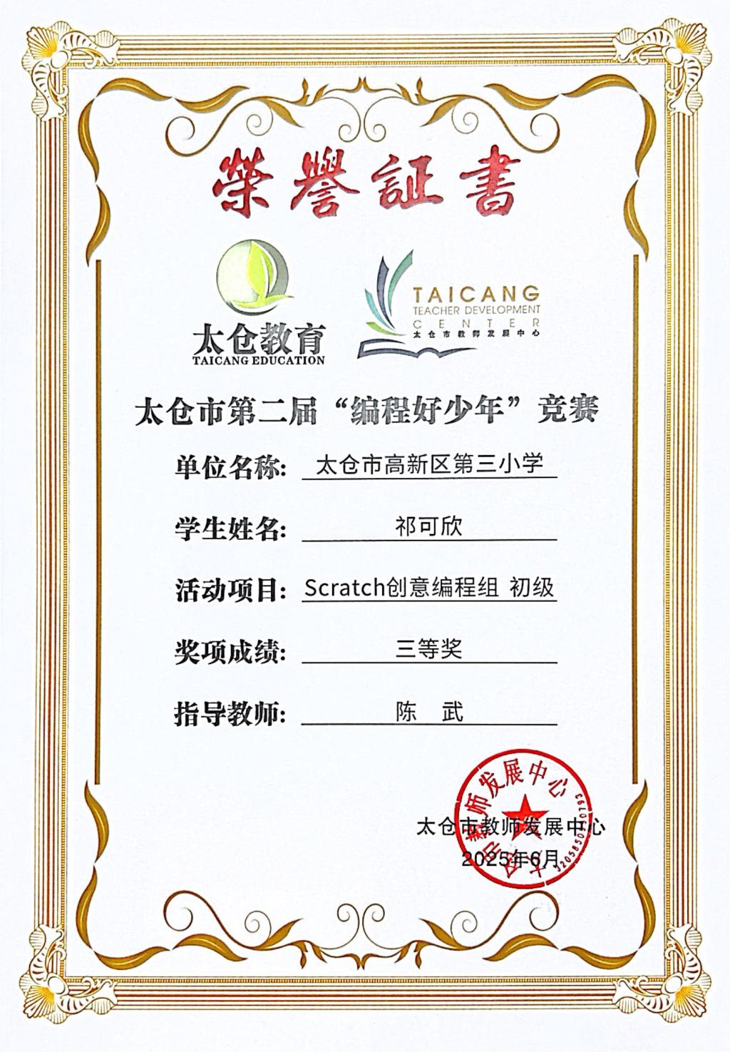 段逸兴、王笑、陈迦美、陈浩睿、凌启宸、刘夏叡、李宥禛、杜铭洋、祁可欣、朱辰悦、李依诺等同学在太仓市第二届“编程好少年”活动中获奖。