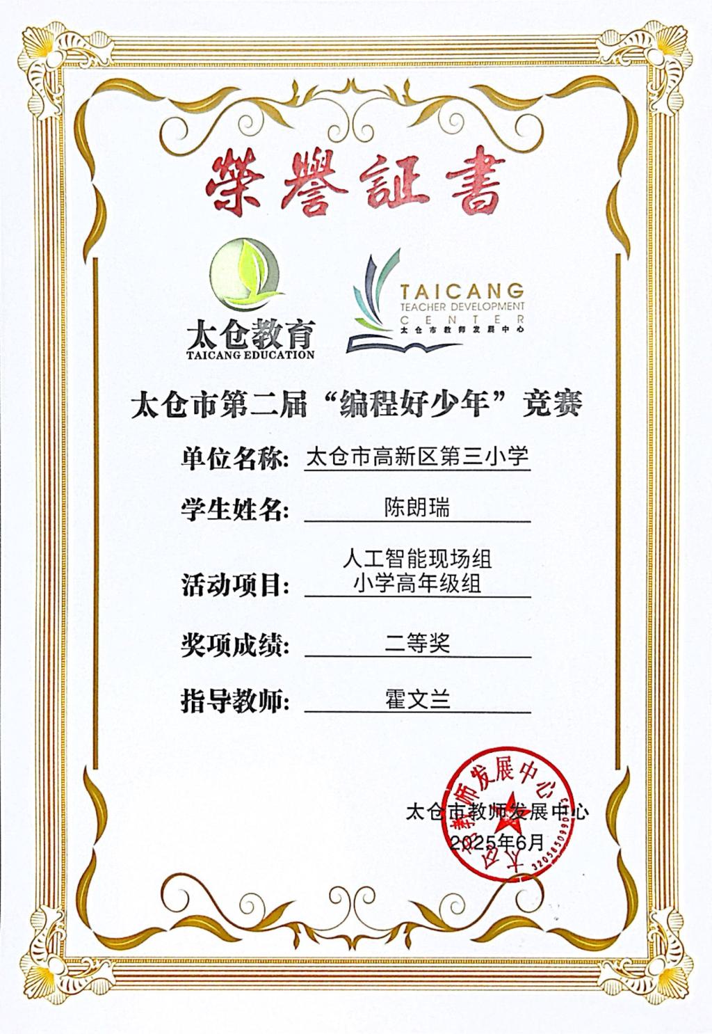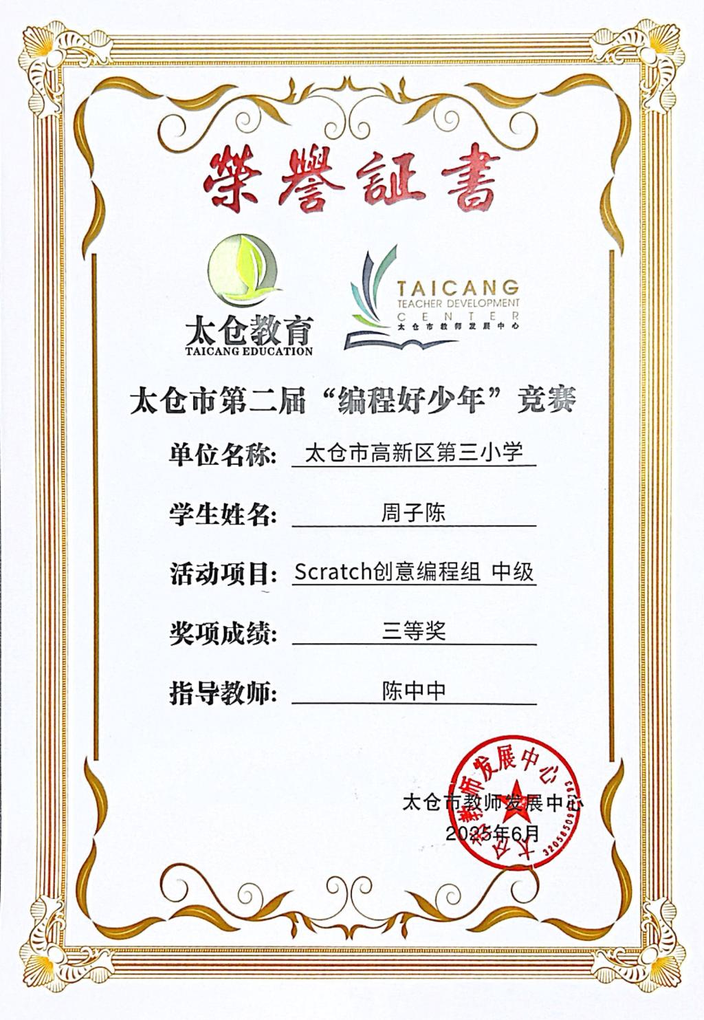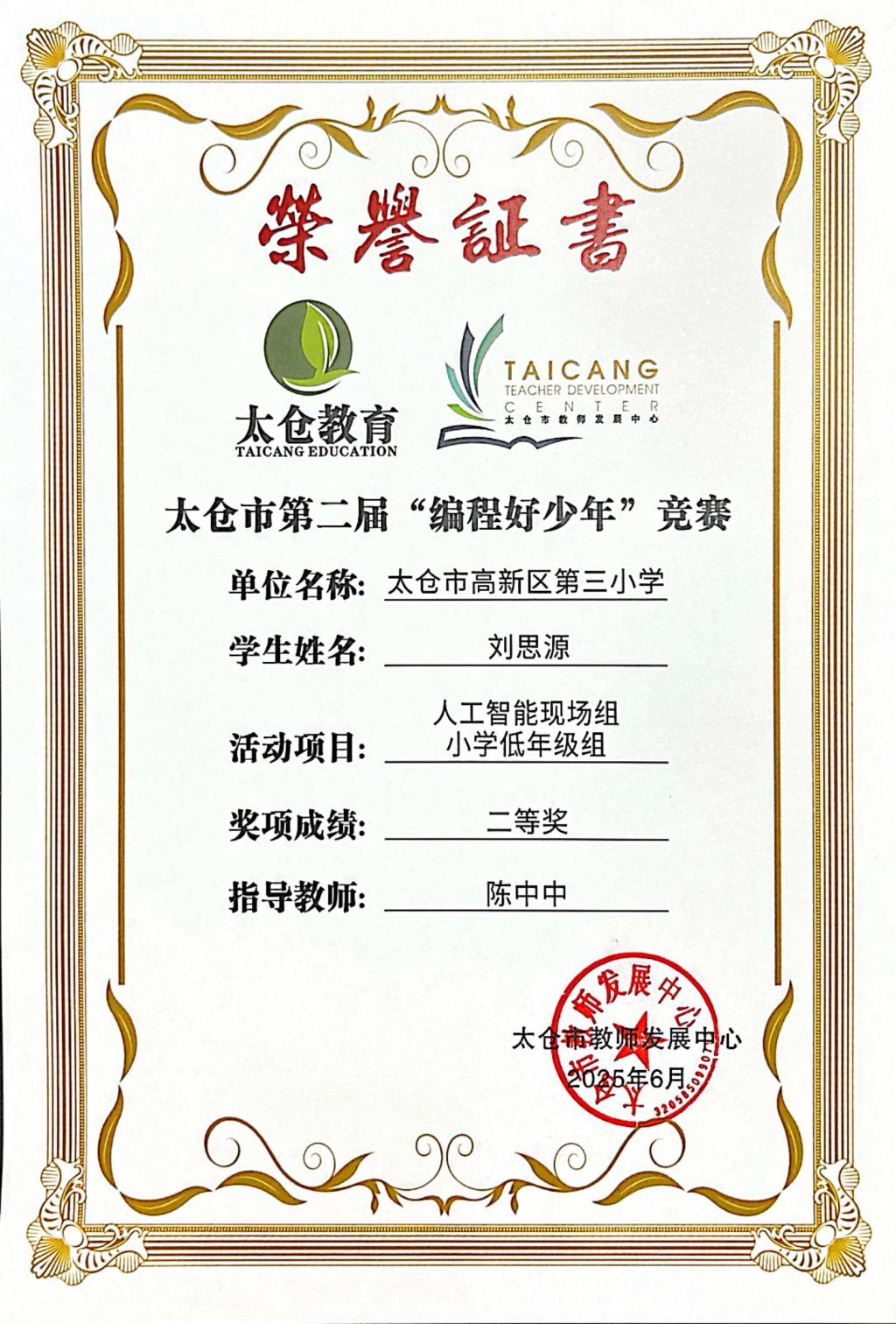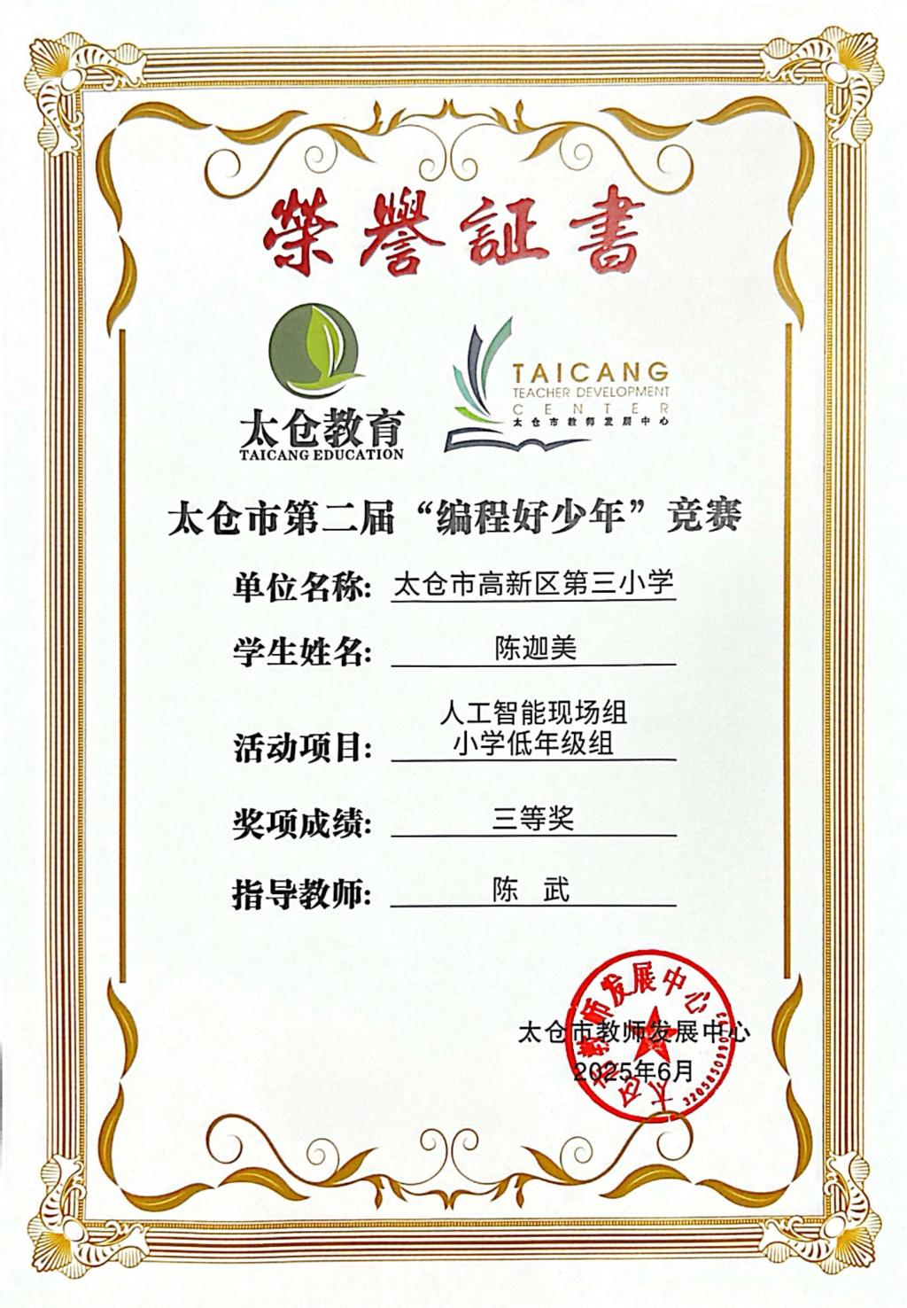 段逸兴、王笑、陈迦美、陈浩睿、凌启宸、刘夏叡、李宥禛、杜铭洋、祁可欣、朱辰悦、李依诺等同学在太仓市第二届“编程好少年”活动中获奖。