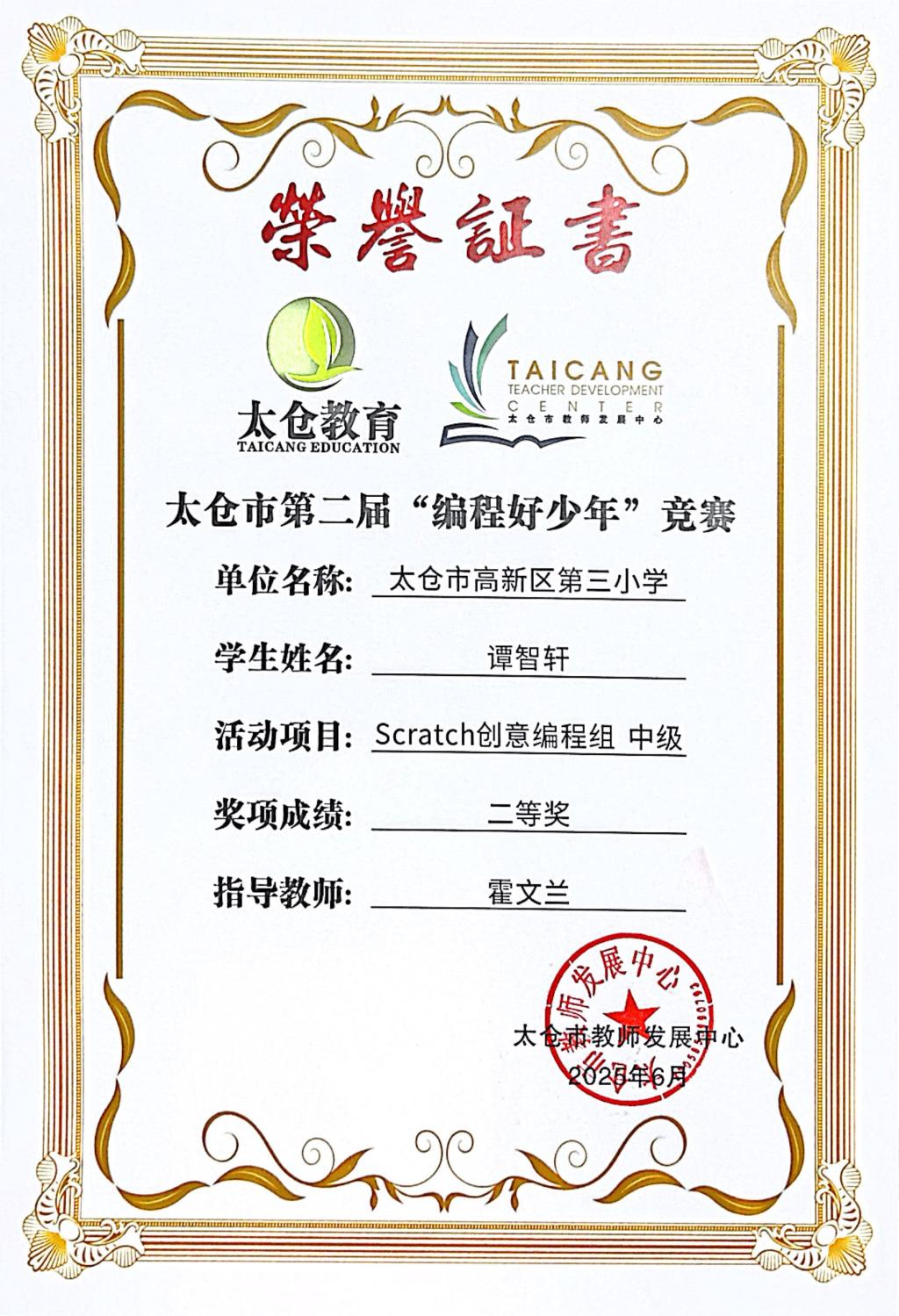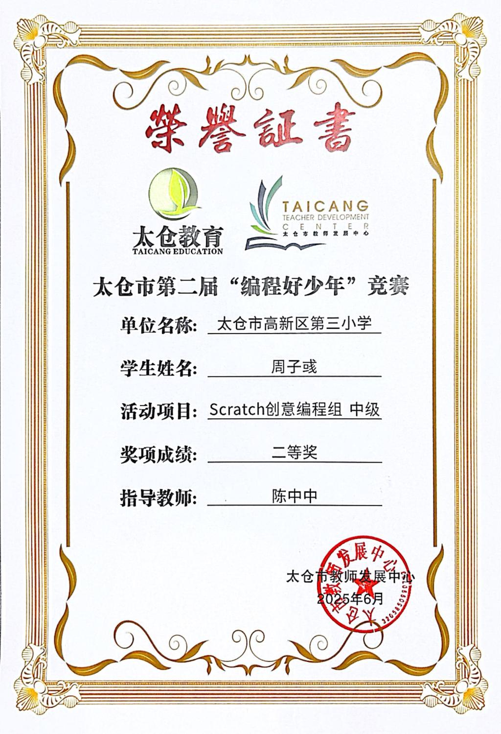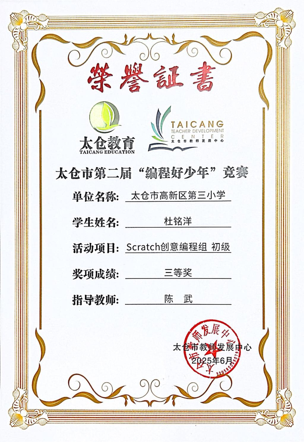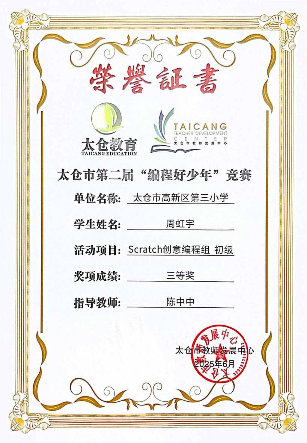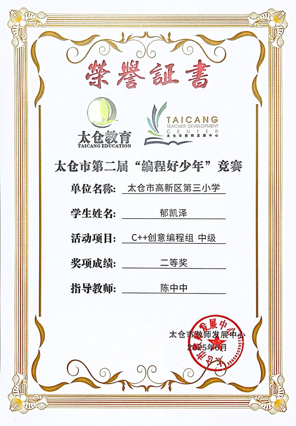 段逸兴、王笑、陈迦美、陈浩睿、凌启宸、刘夏叡、李宥禛、杜铭洋、祁可欣、朱辰悦、李依诺等同学在太仓市第二届“编程好少年”活动中获奖。