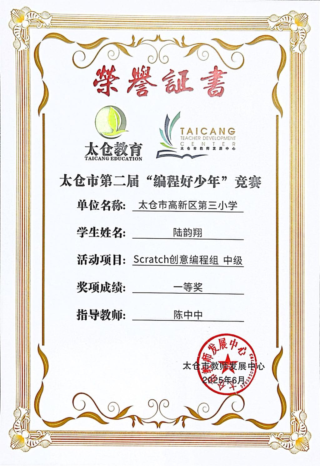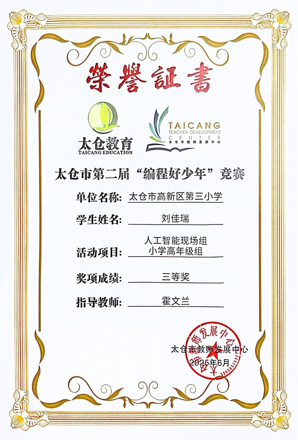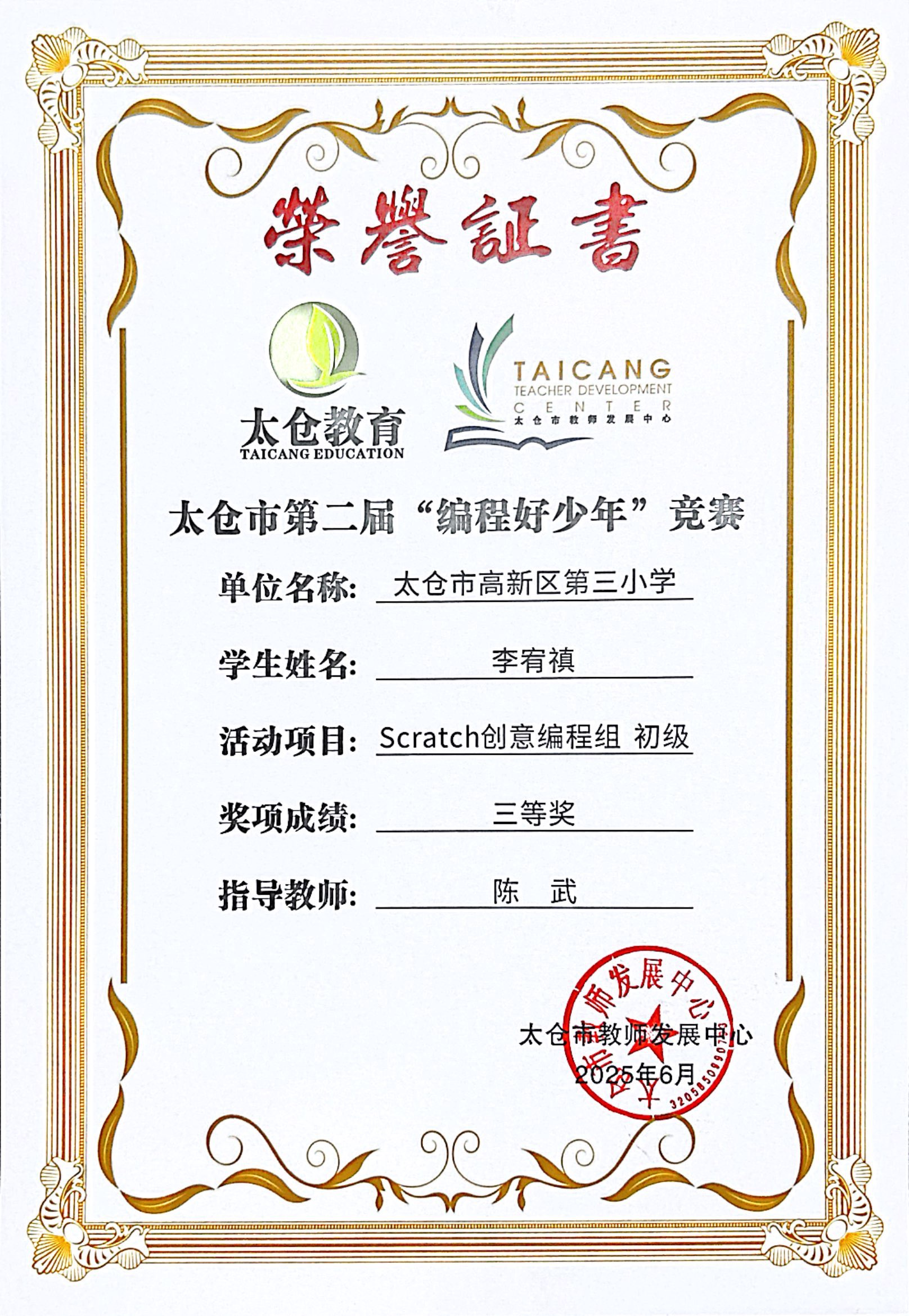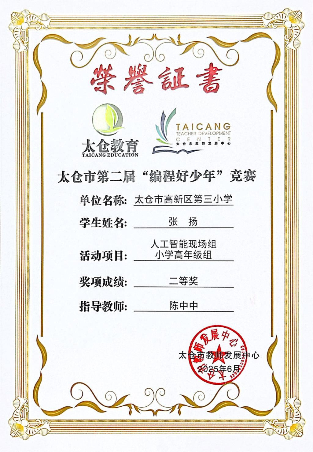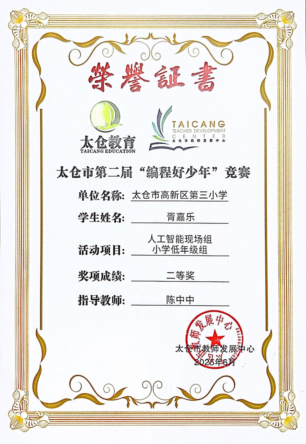 段逸兴、王笑、陈迦美、陈浩睿、凌启宸、刘夏叡、李宥禛、杜铭洋、祁可欣、朱辰悦、李依诺等同学在太仓市第二届“编程好少年”活动中获奖。