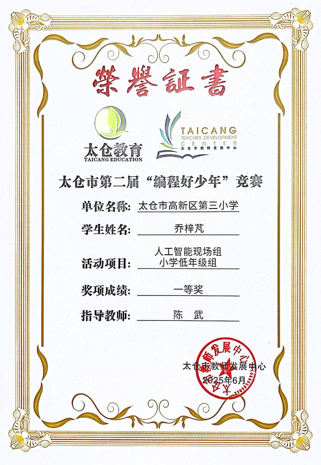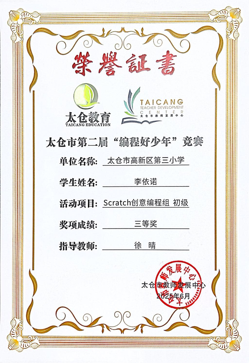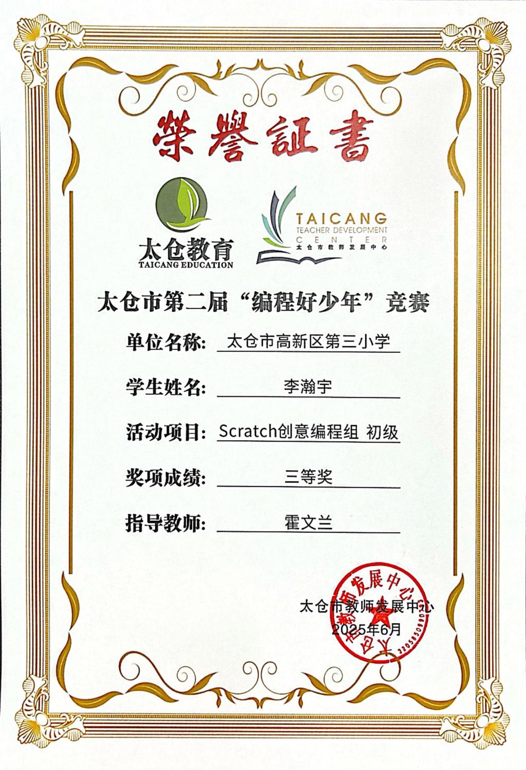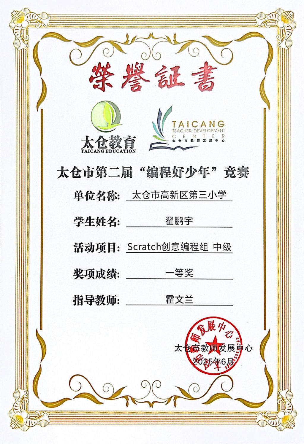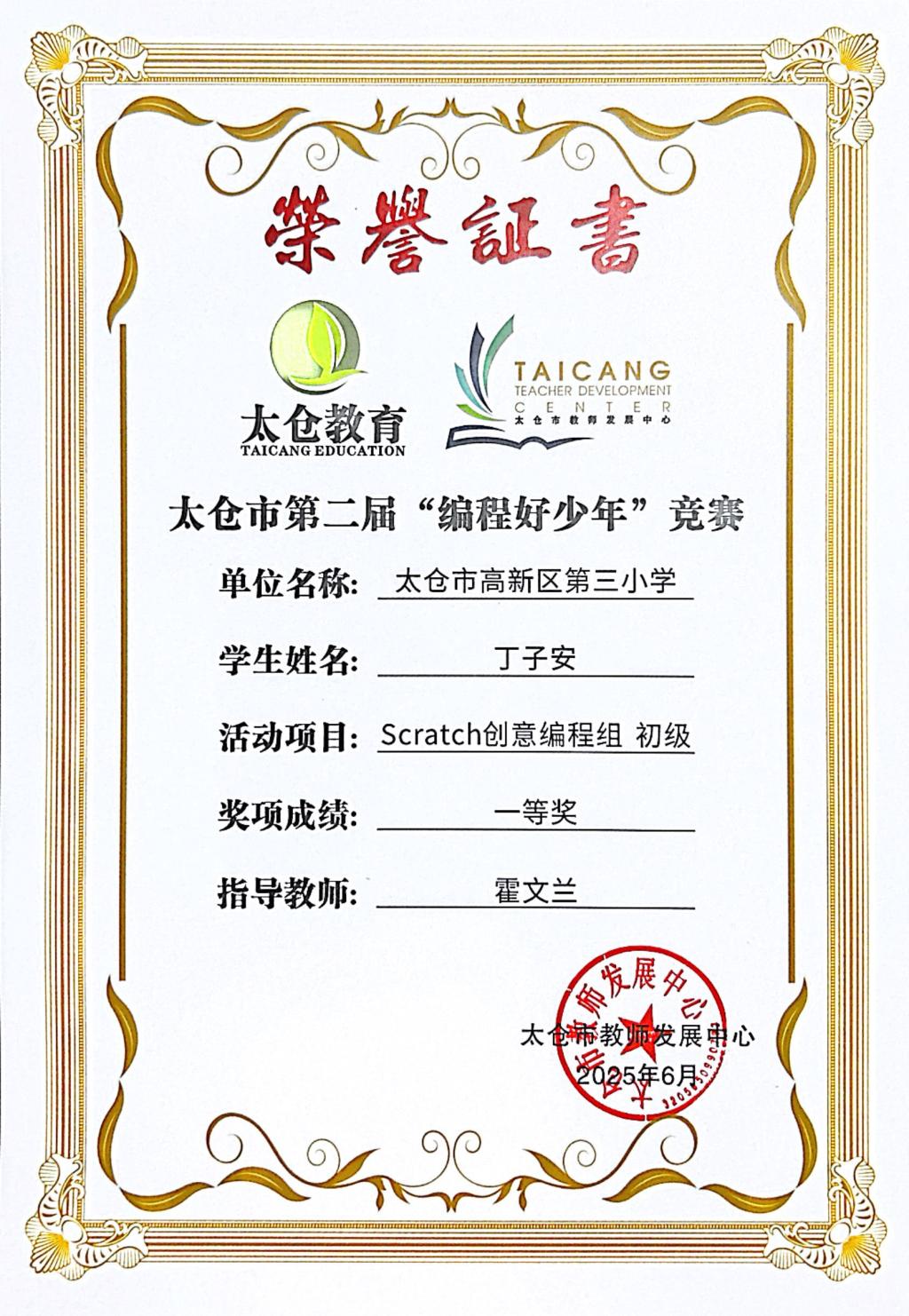段逸兴、王笑、陈迦美、陈浩睿、凌启宸、刘夏叡、李宥禛、杜铭洋、祁可欣、朱辰悦、李依诺等同学在太仓市第二届“编程好少年”活动中获奖。