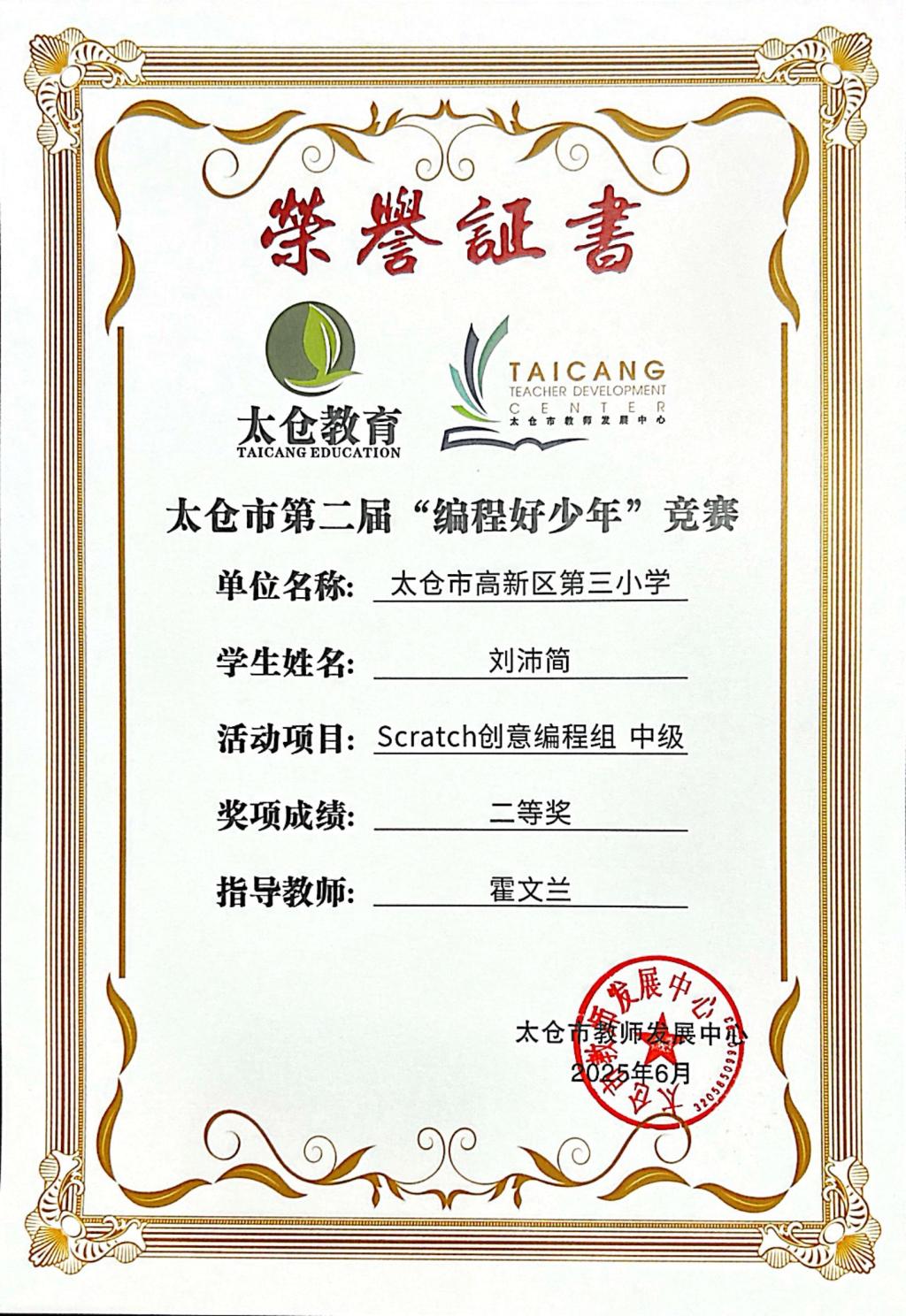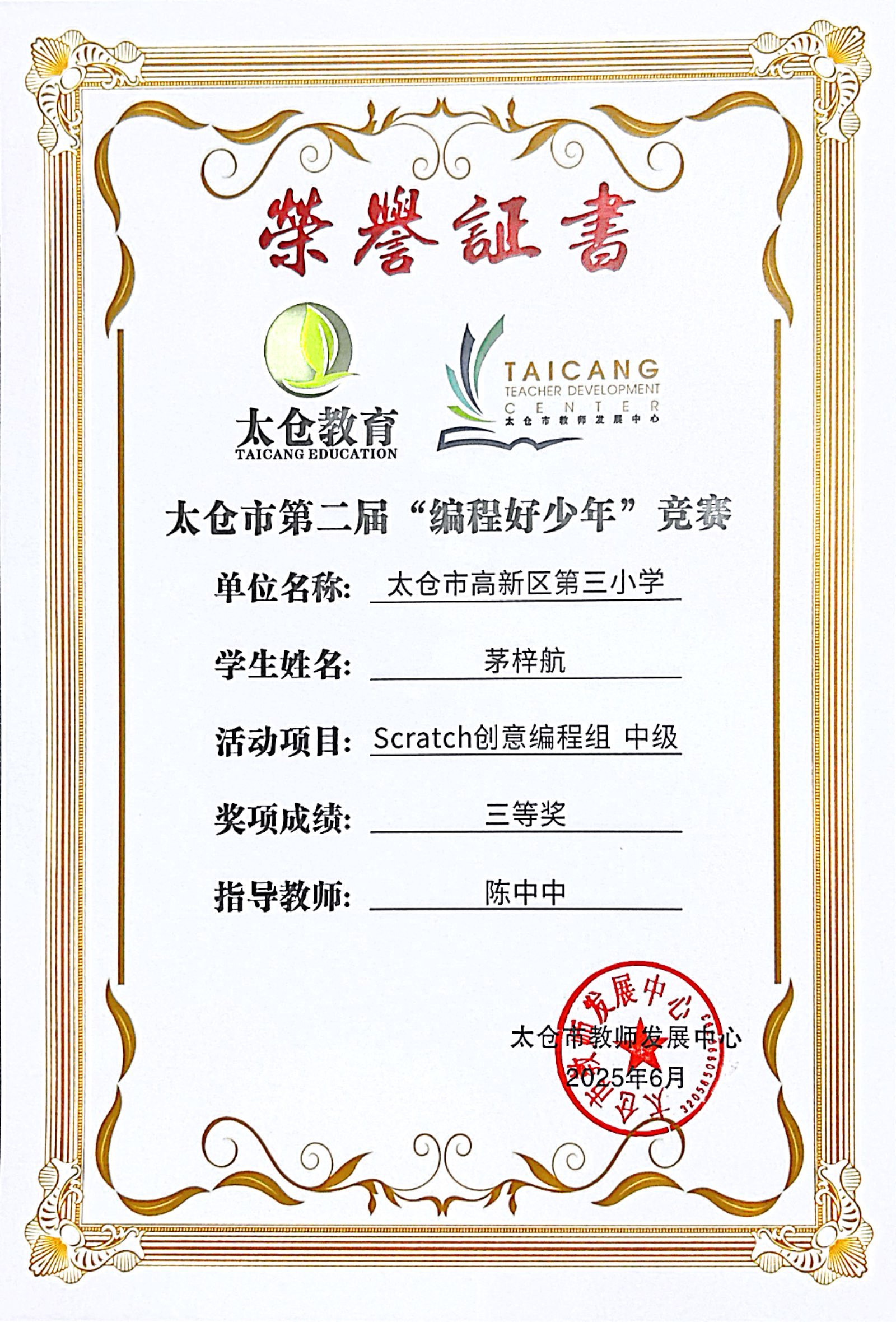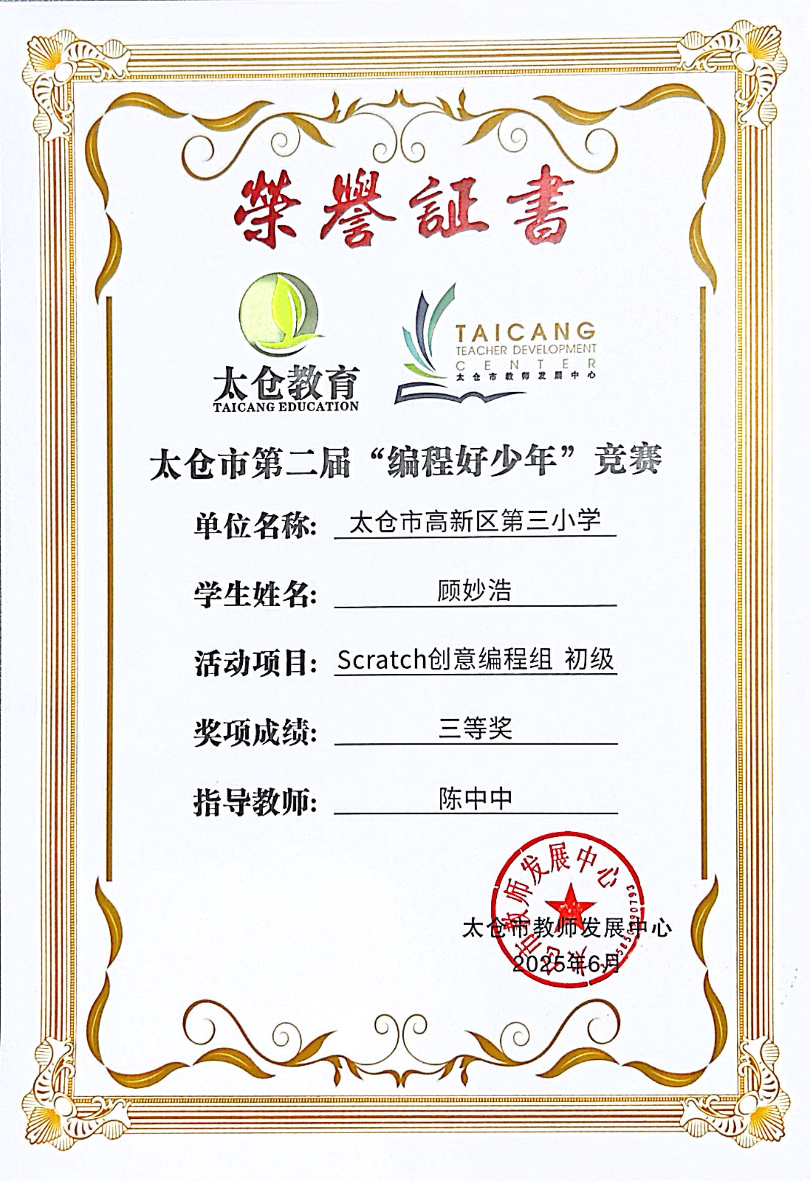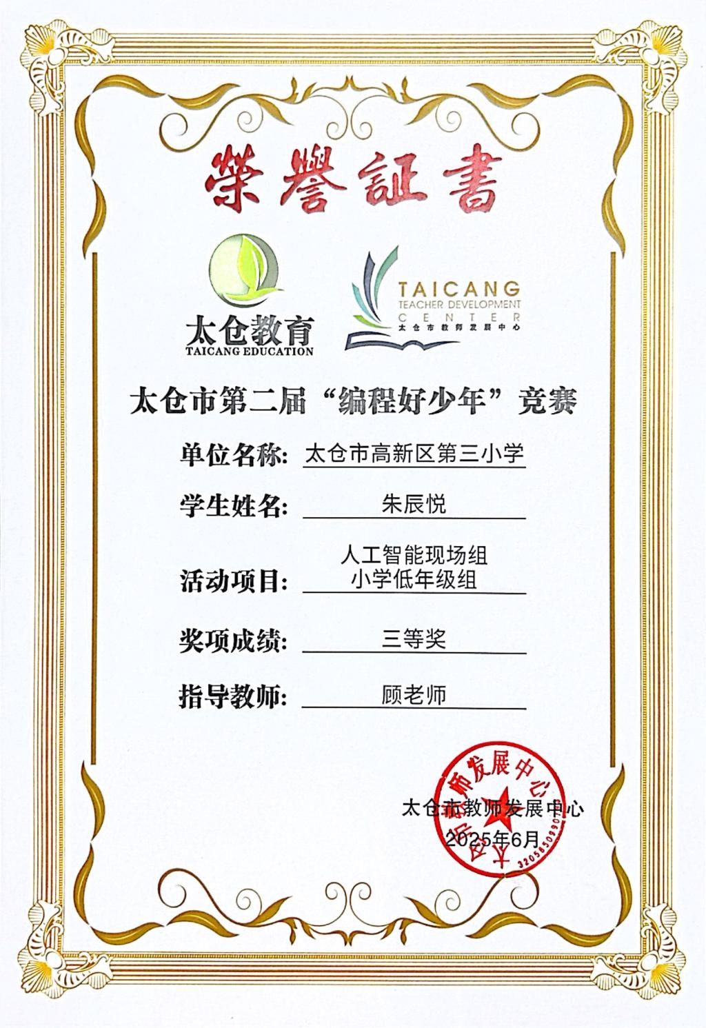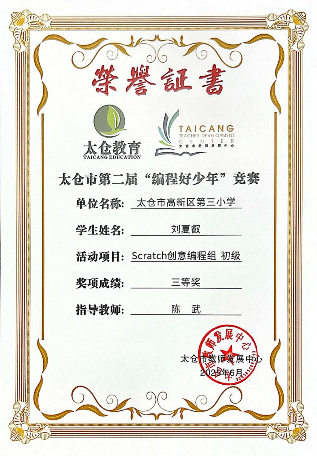 段逸兴、王笑、陈迦美、陈浩睿、凌启宸、刘夏叡、李宥禛、杜铭洋、祁可欣、朱辰悦、李依诺等同学在太仓市第二届“编程好少年”活动中获奖。