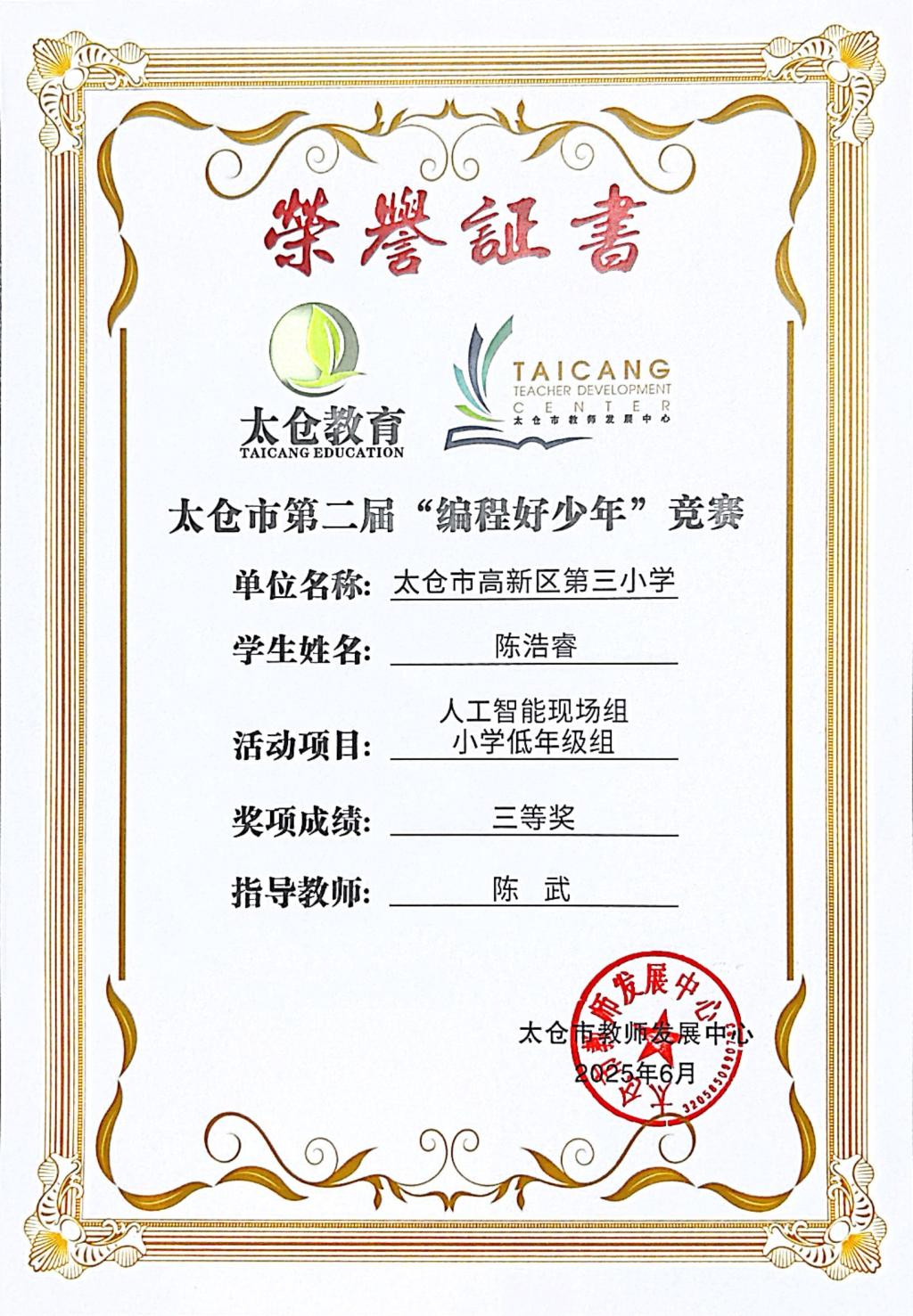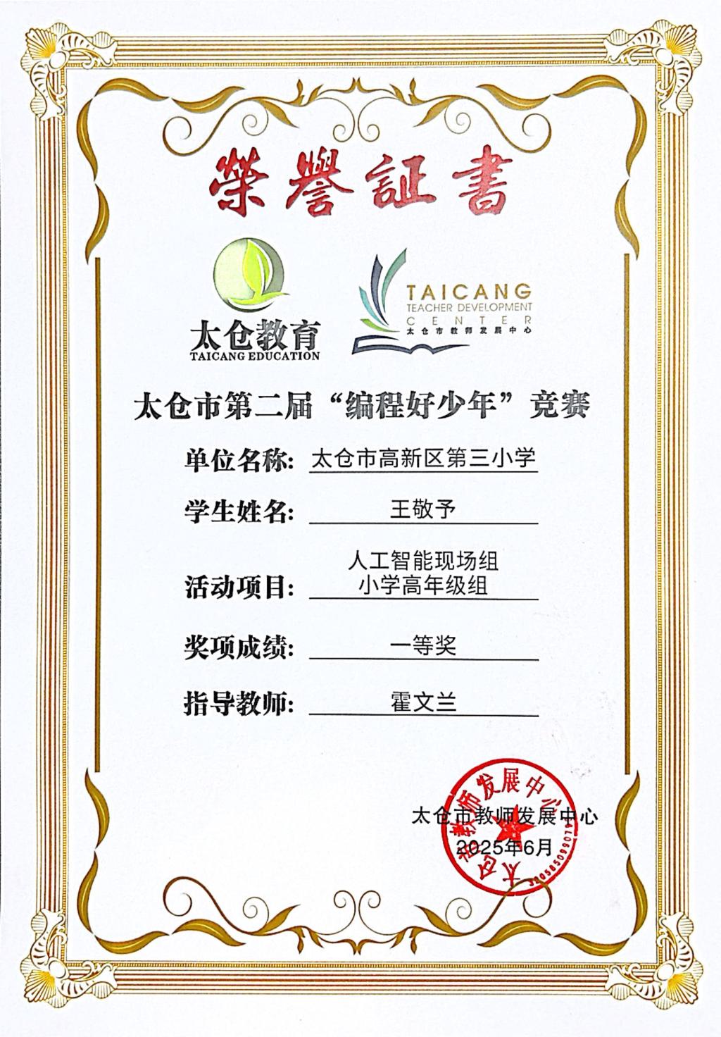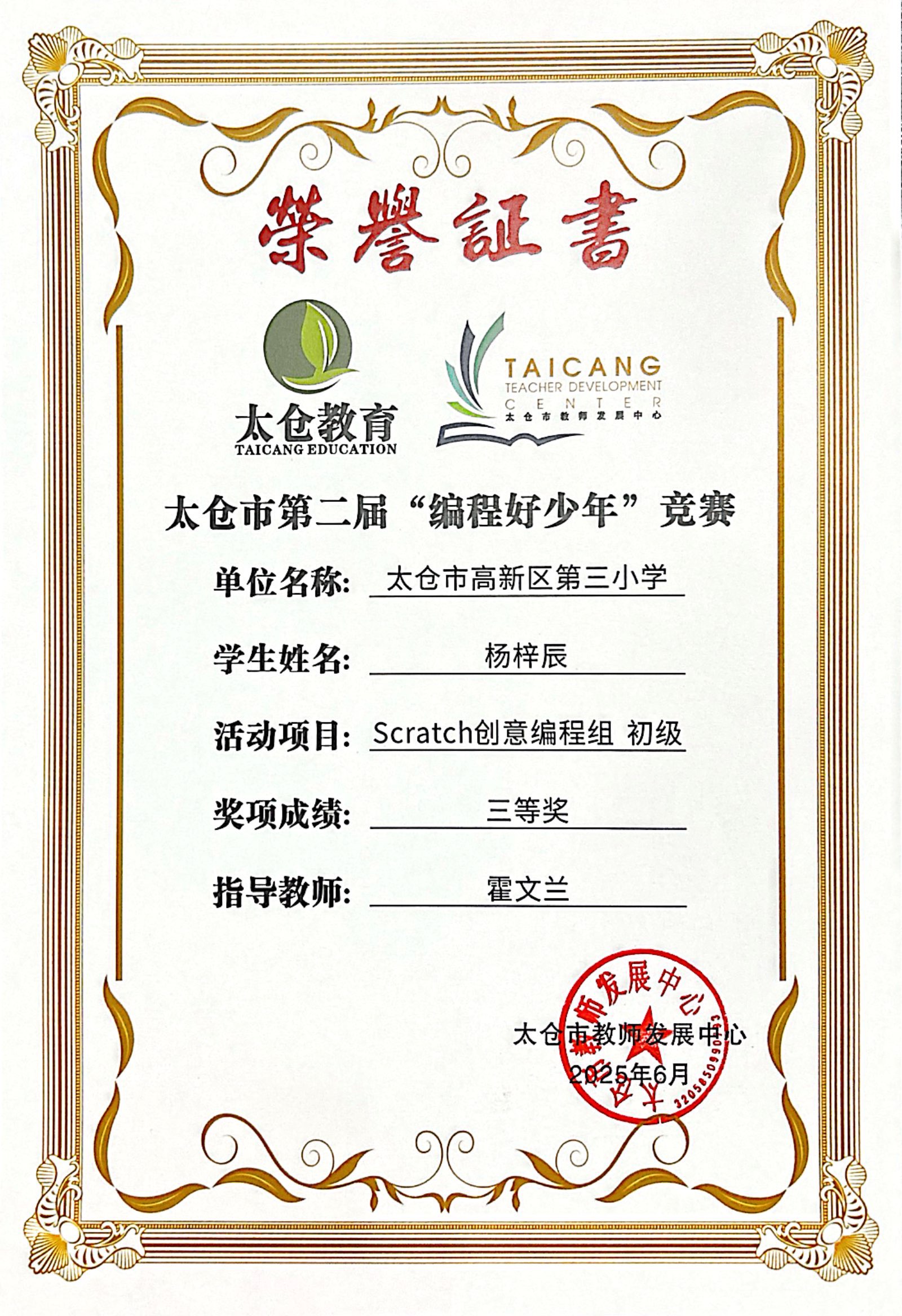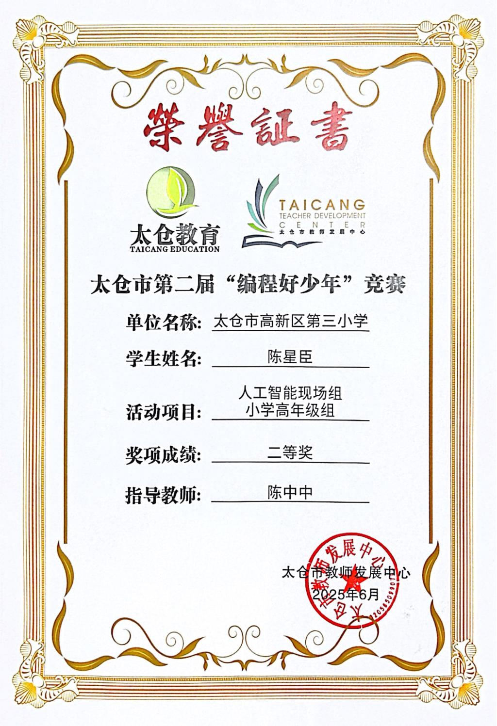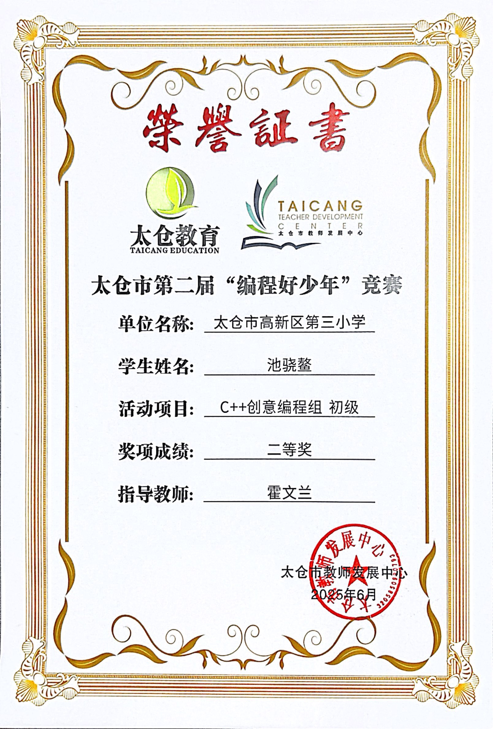 段逸兴、王笑、陈迦美、陈浩睿、凌启宸、刘夏叡、李宥禛、杜铭洋、祁可欣、朱辰悦、李依诺等同学在太仓市第二届“编程好少年”活动中获奖。