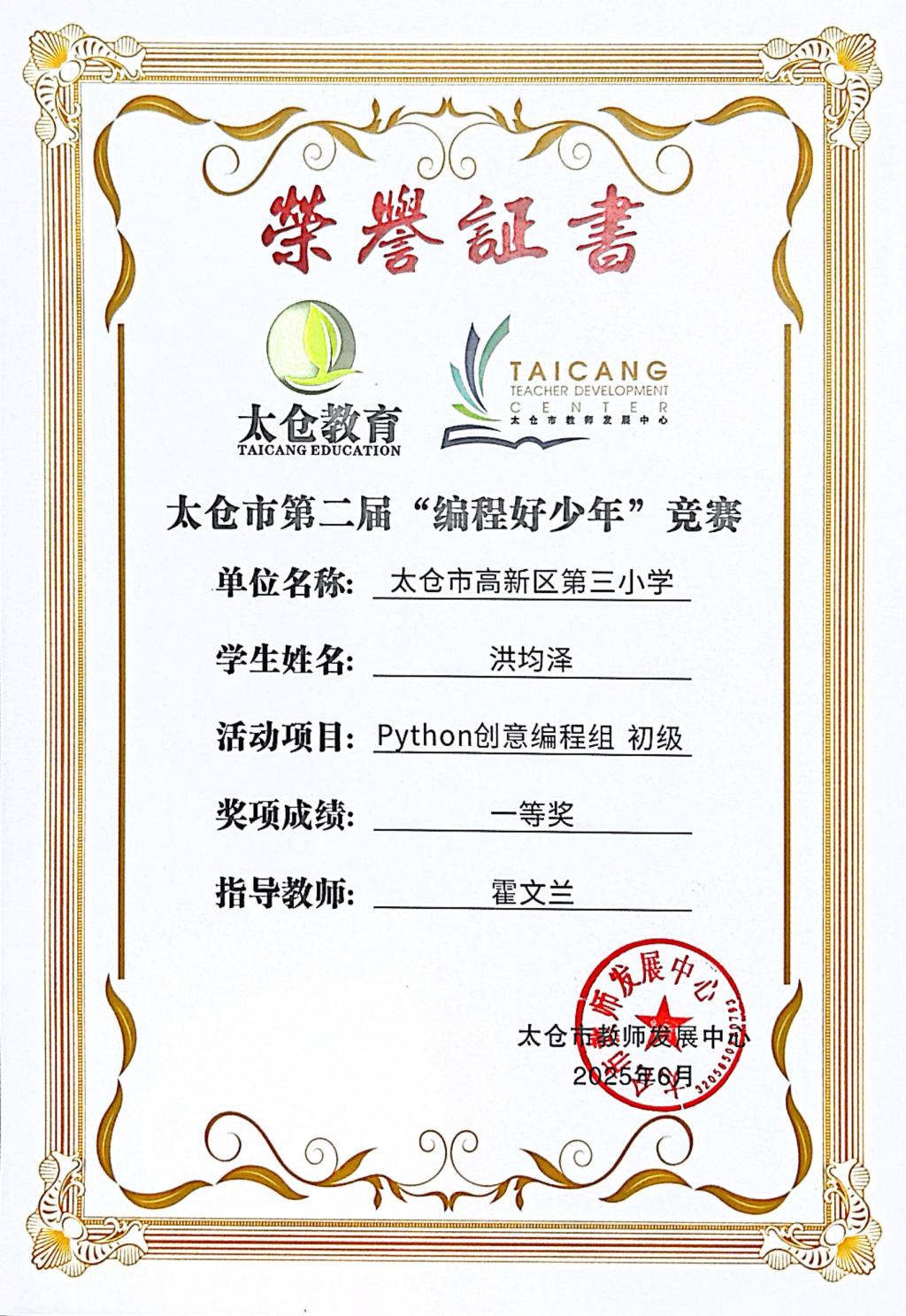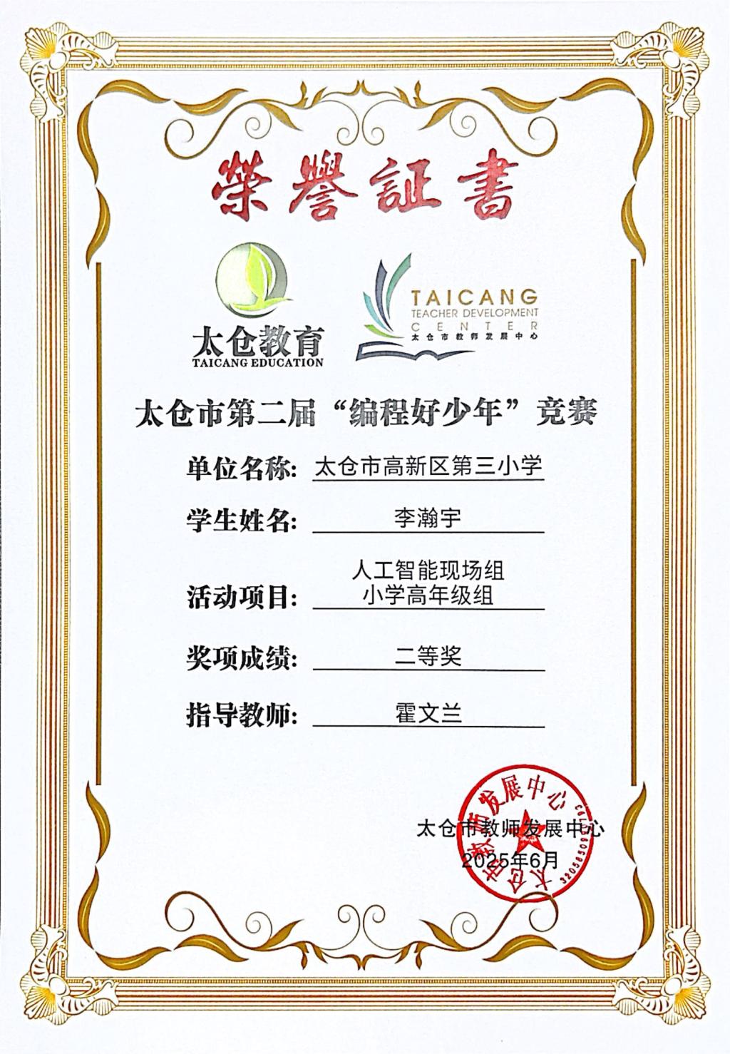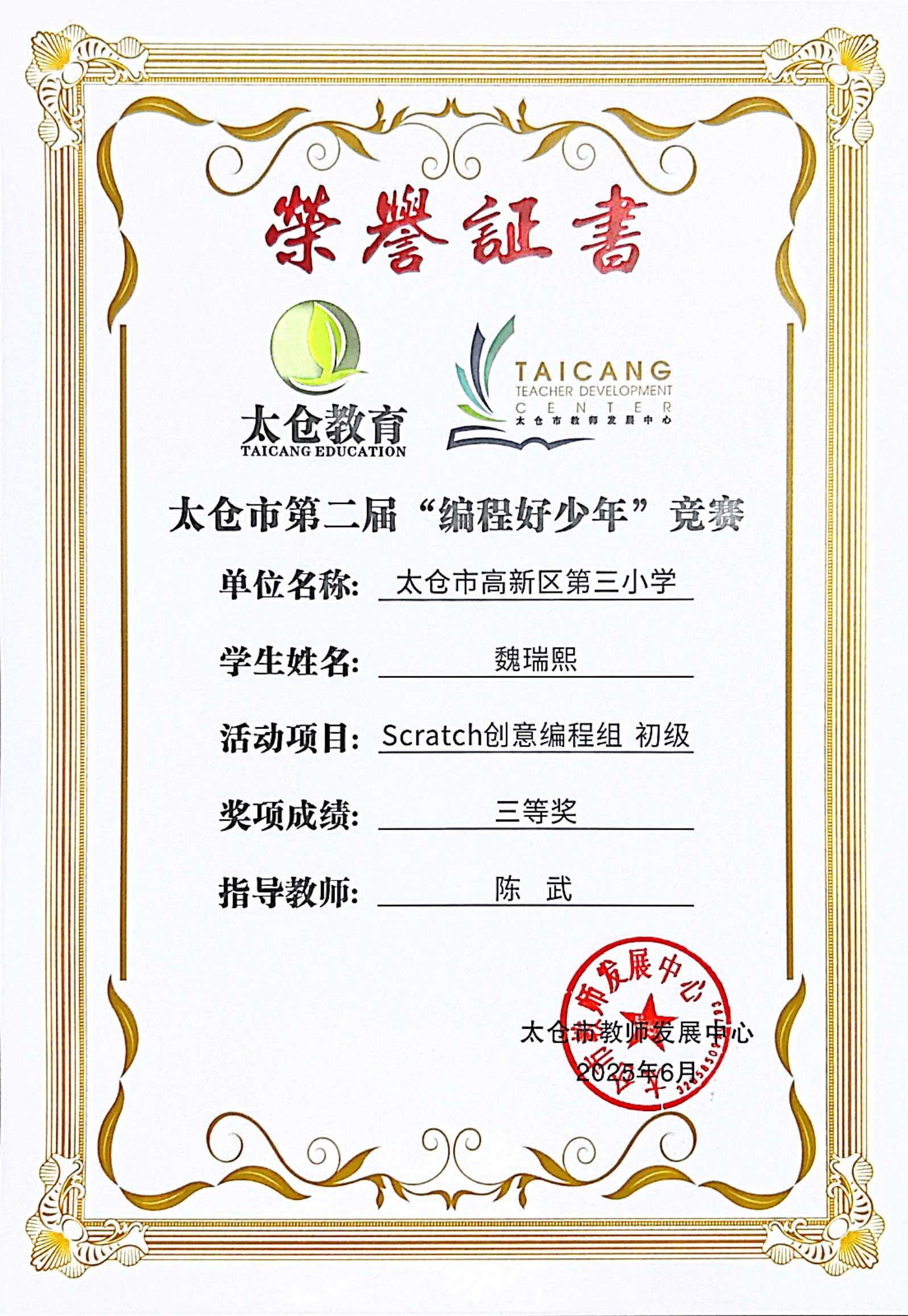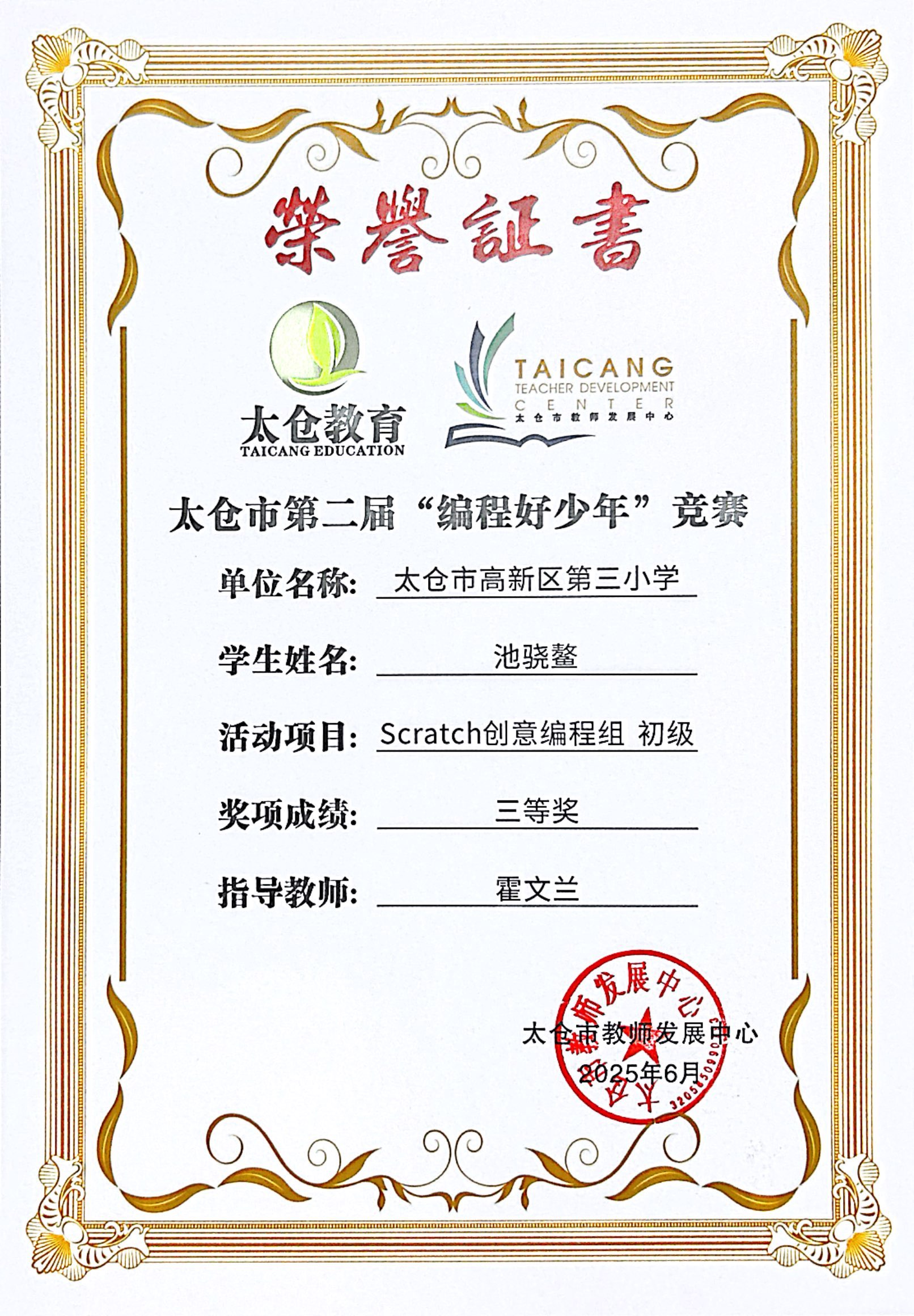 段逸兴、王笑、陈迦美、陈浩睿、凌启宸、刘夏叡、李宥禛、杜铭洋、祁可欣、朱辰悦、李依诺等同学在太仓市第二届“编程好少年”活动中获奖。