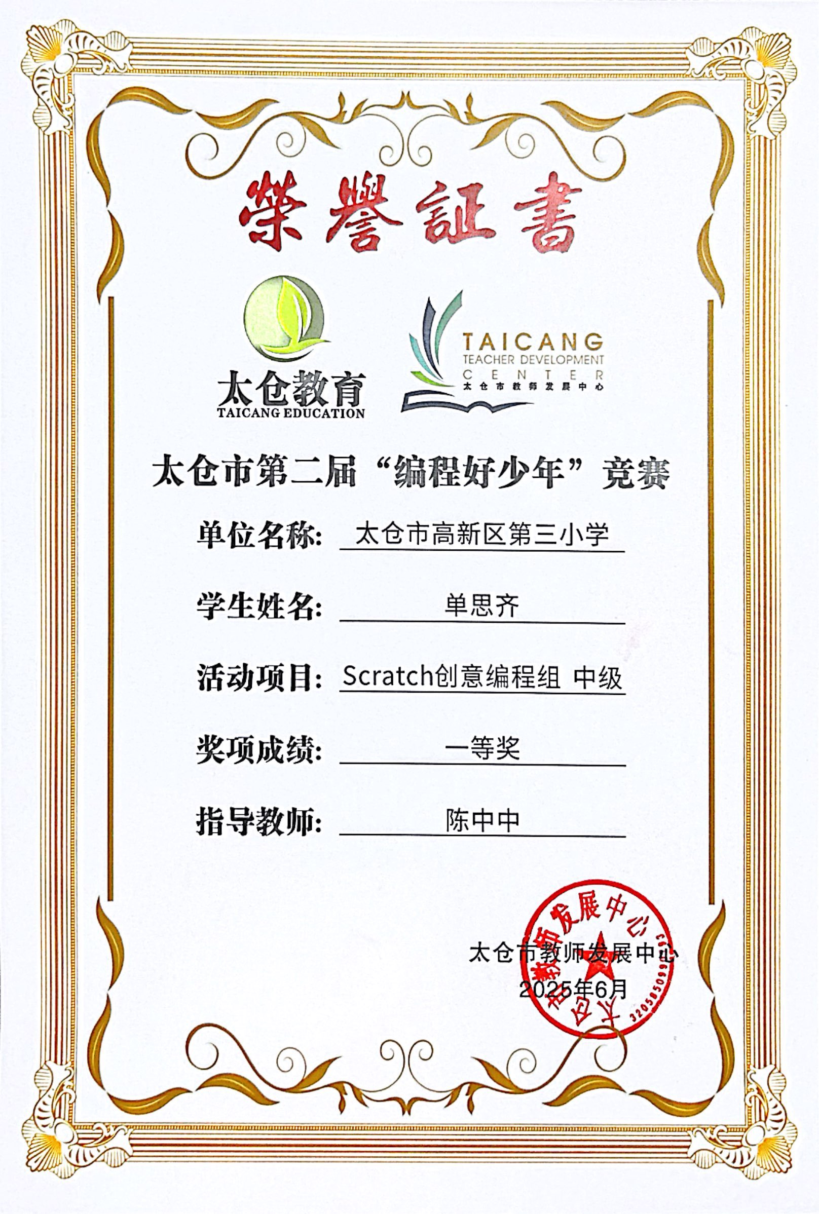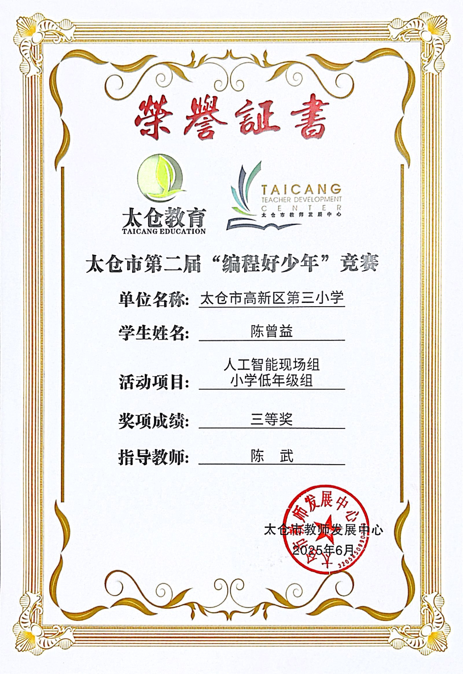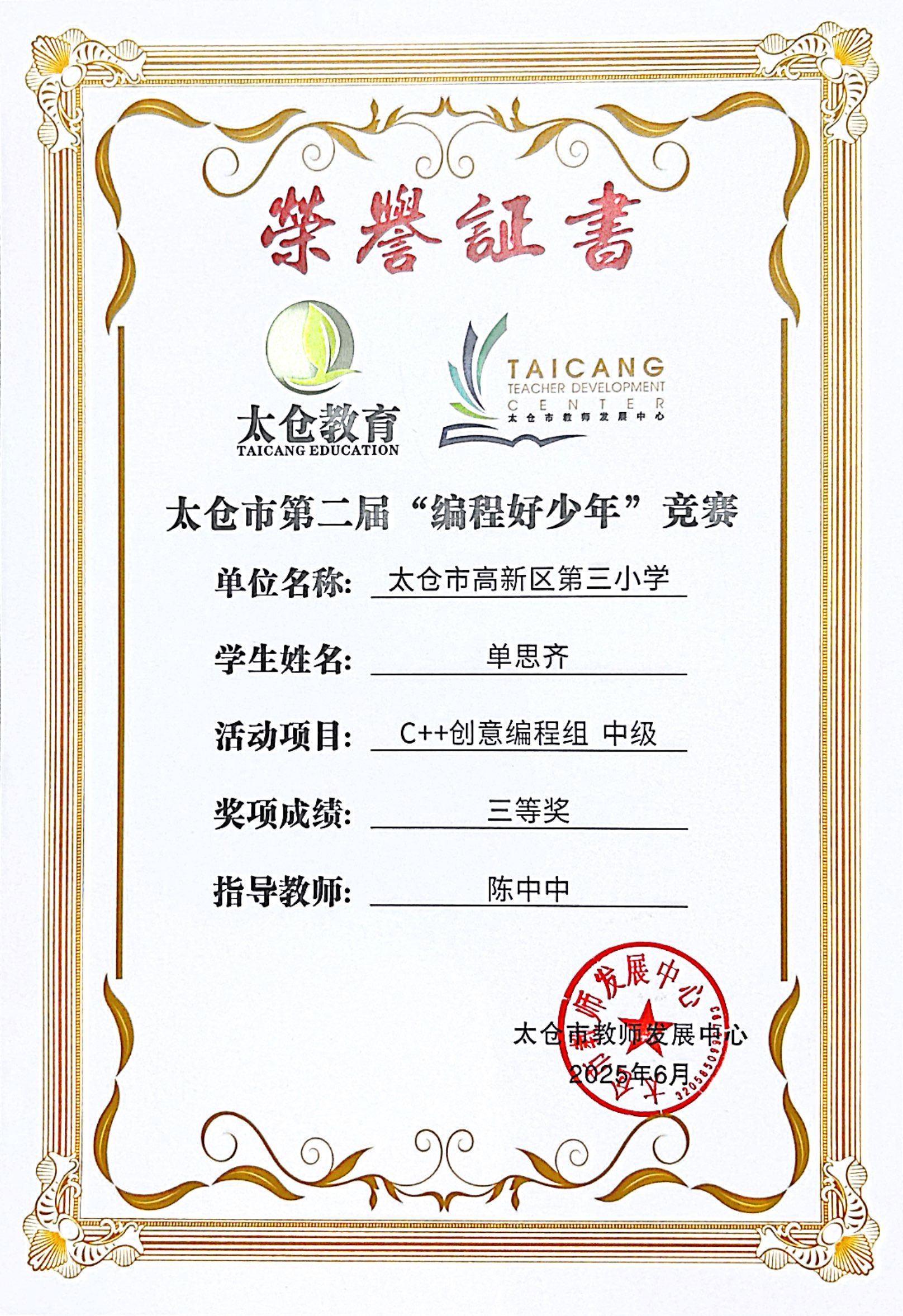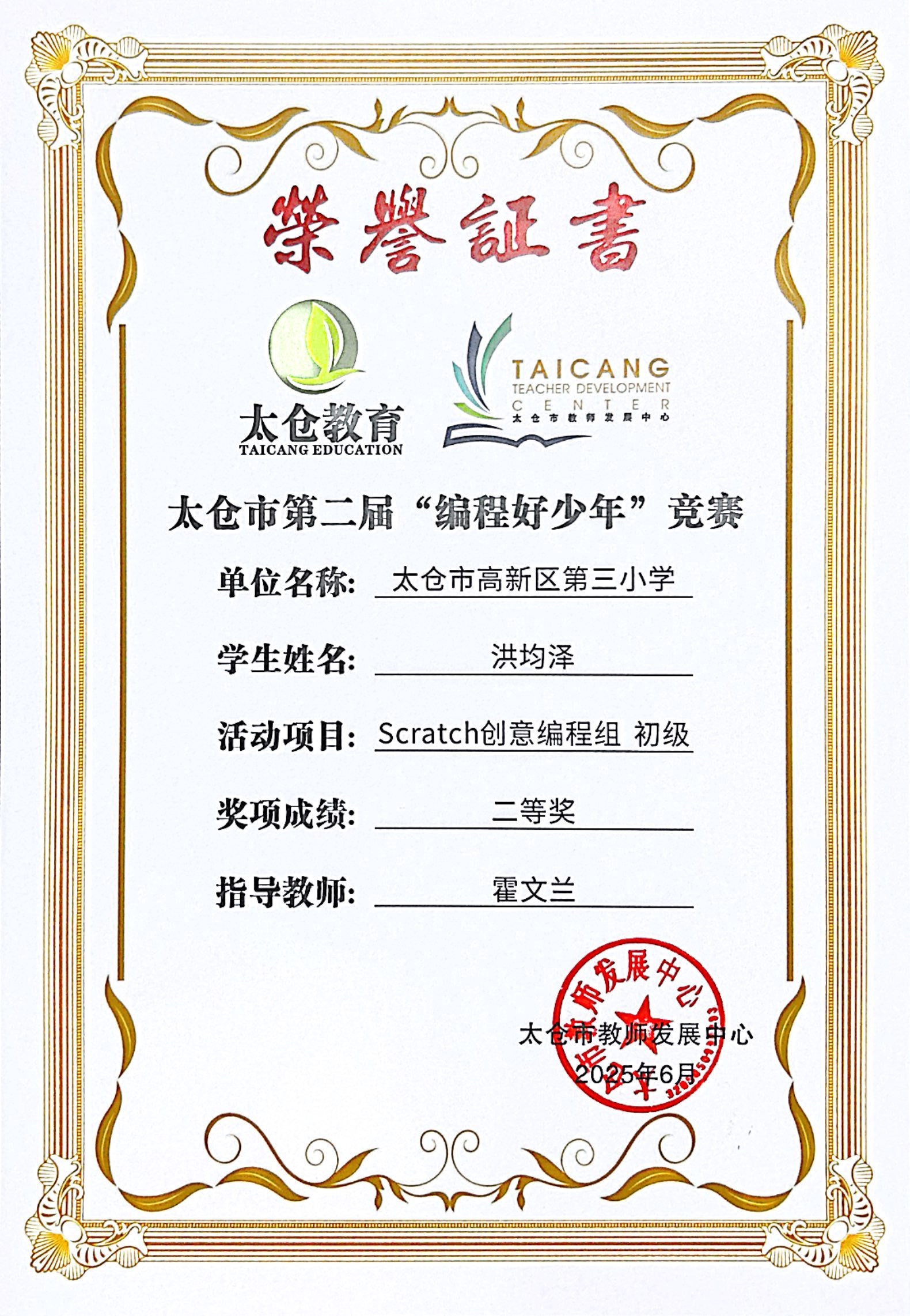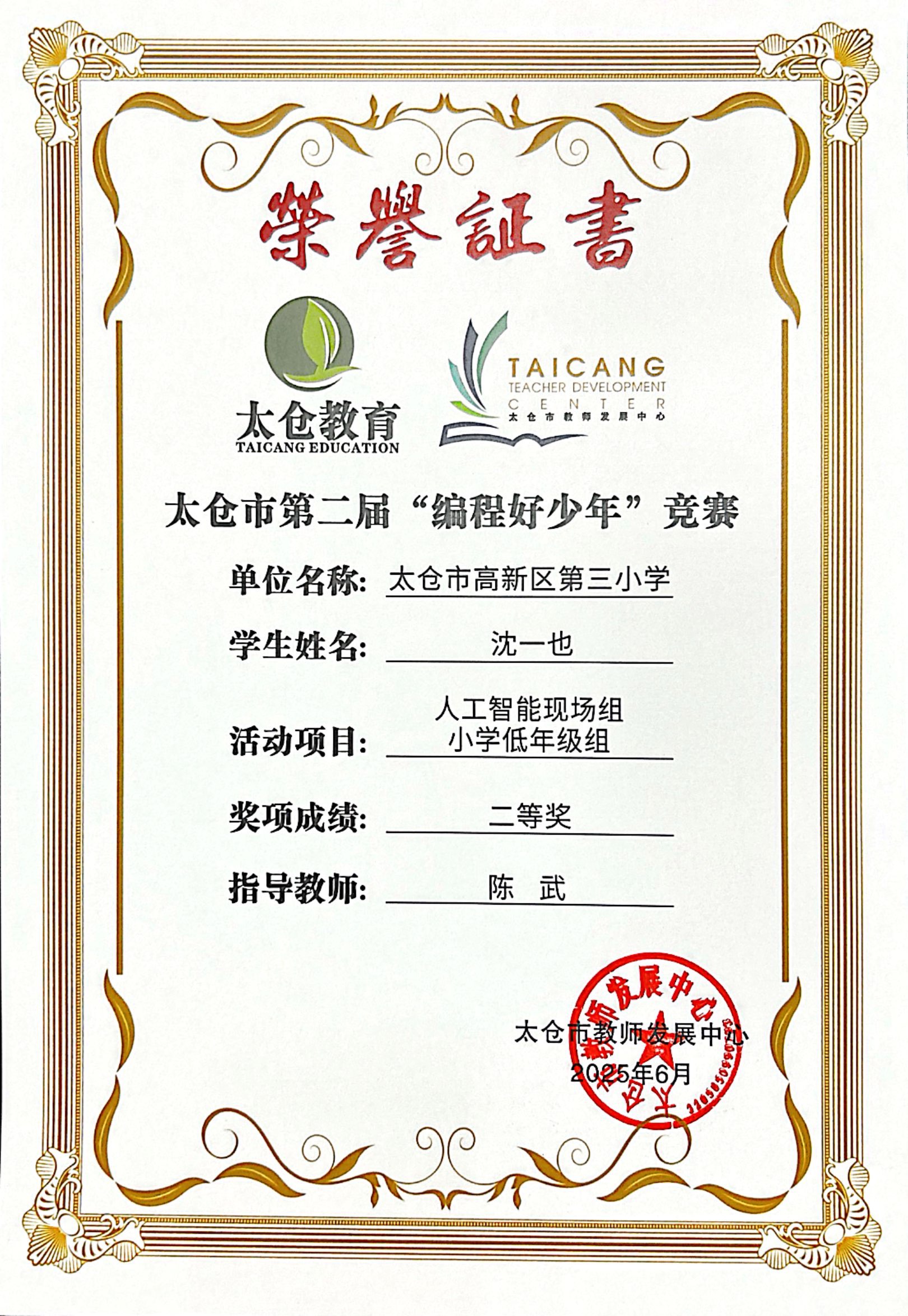 段逸兴、王笑、陈迦美、陈浩睿、凌启宸、刘夏叡、李宥禛、杜铭洋、祁可欣、朱辰悦、李依诺等同学在太仓市第二届“编程好少年”活动中获奖。
