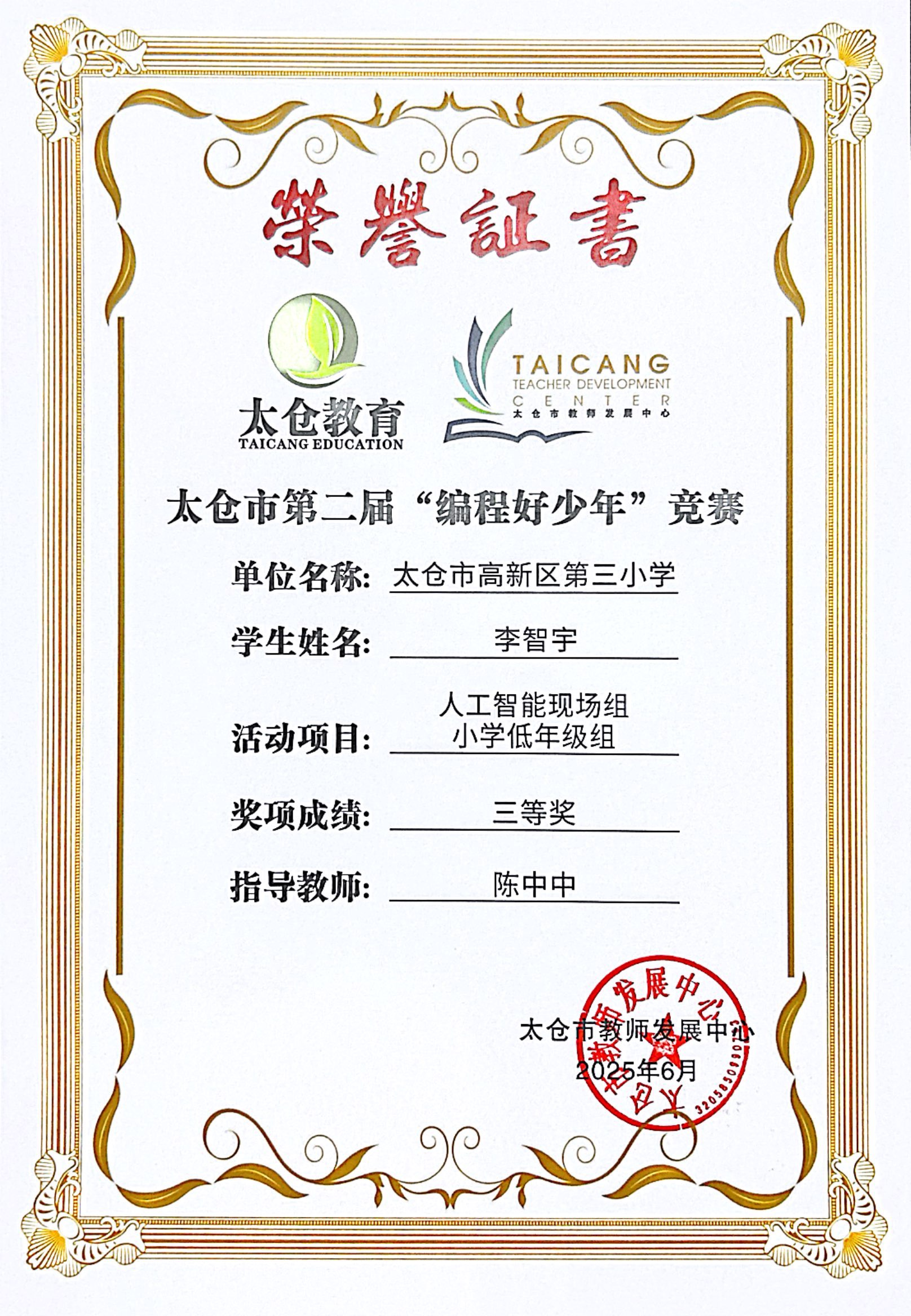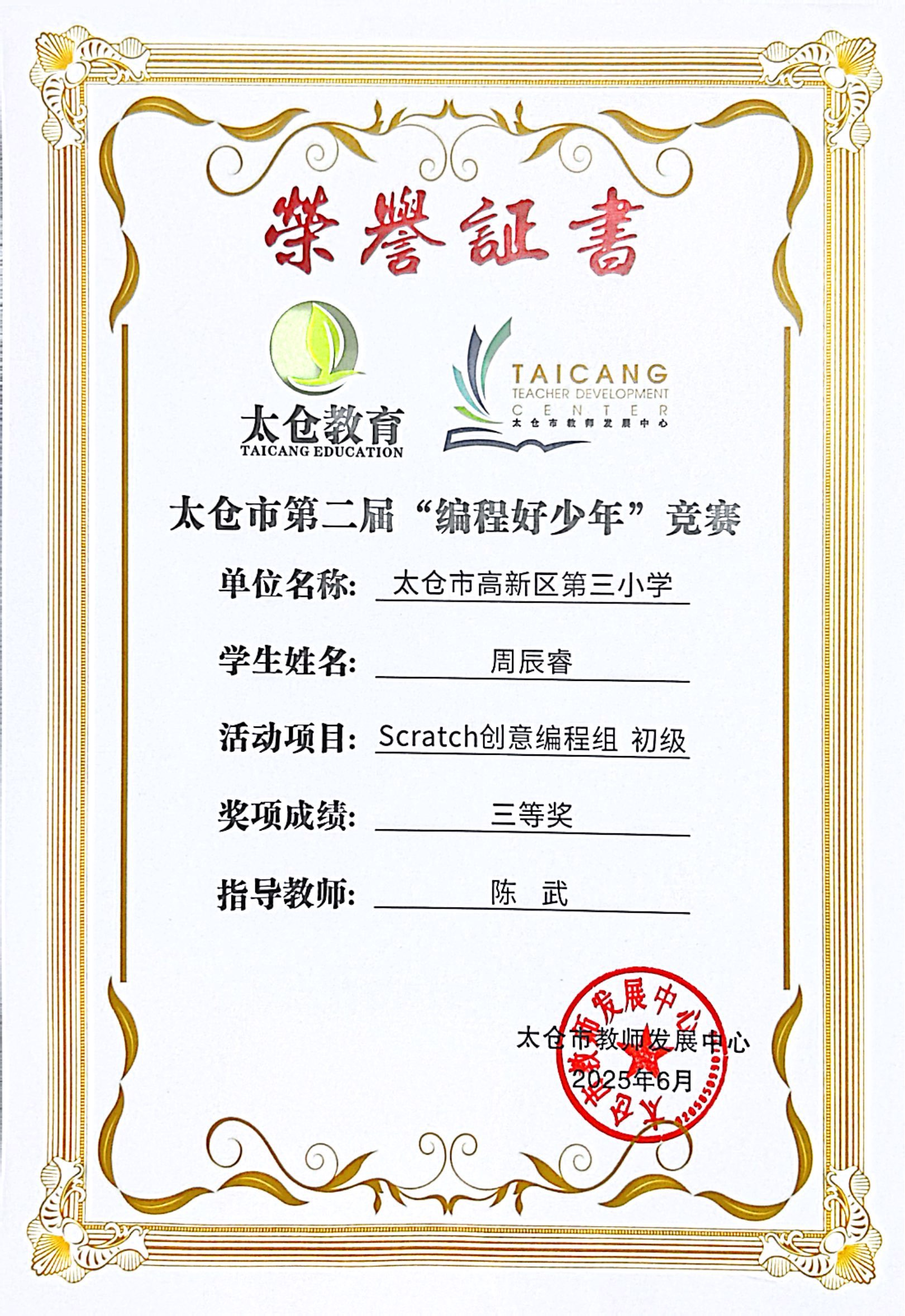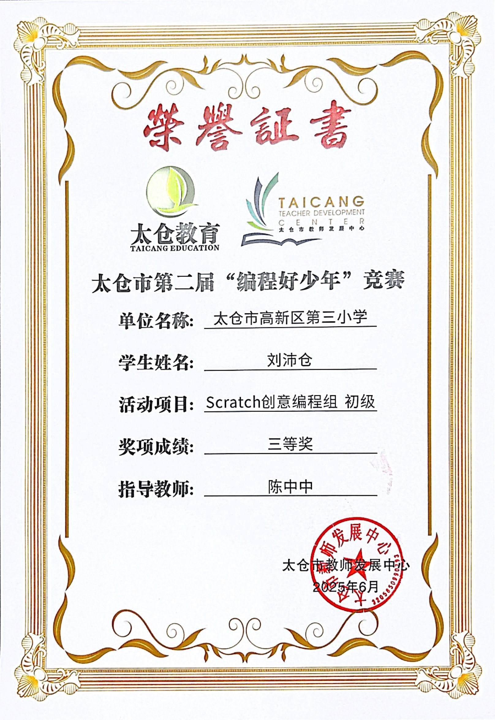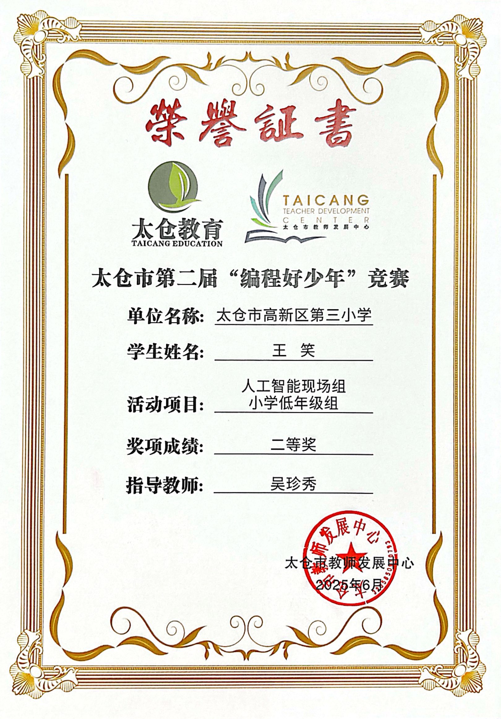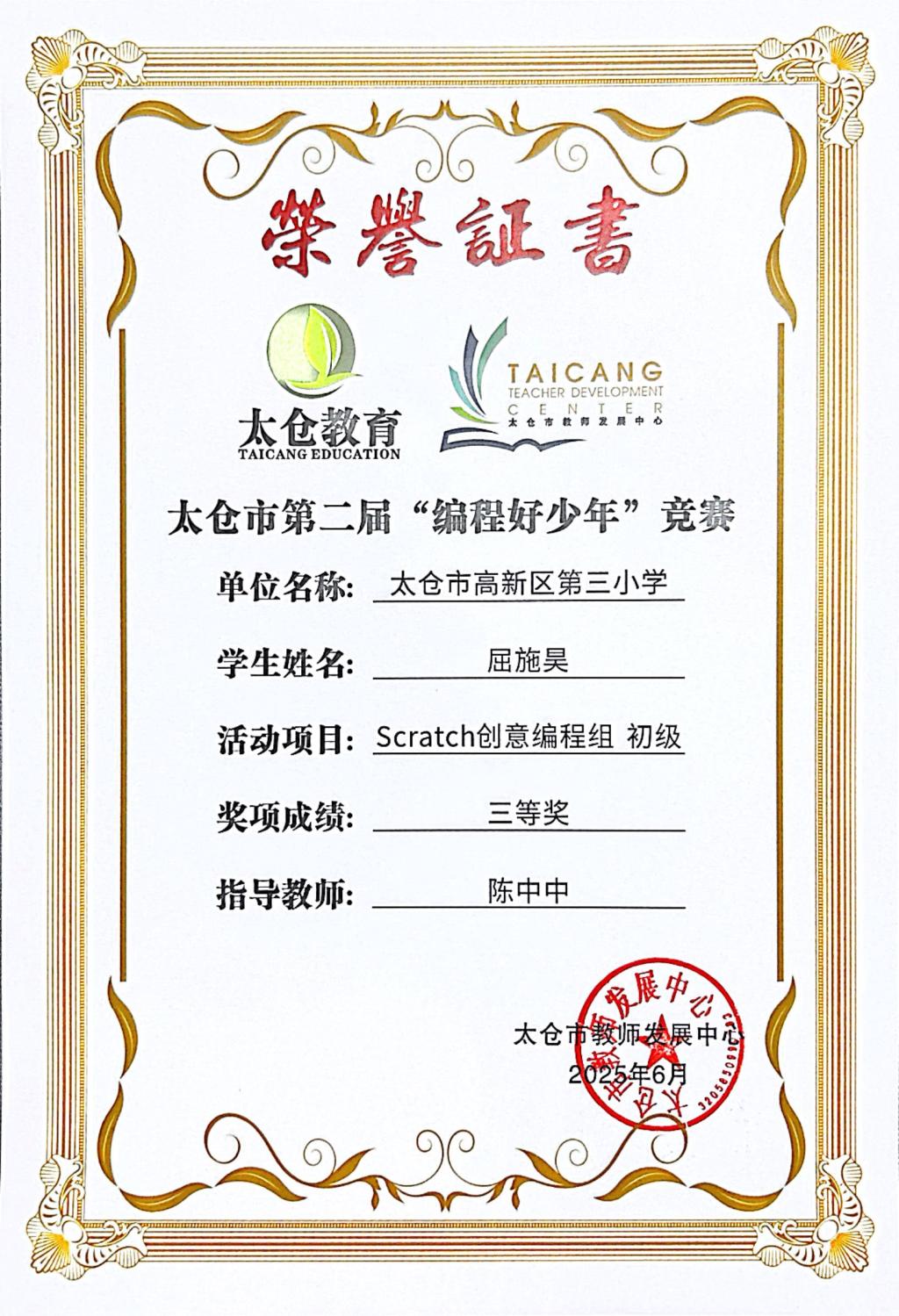 段逸兴、王笑、陈迦美、陈浩睿、凌启宸、刘夏叡、李宥禛、杜铭洋、祁可欣、朱辰悦、李依诺等同学在太仓市第二届“编程好少年”活动中获奖。