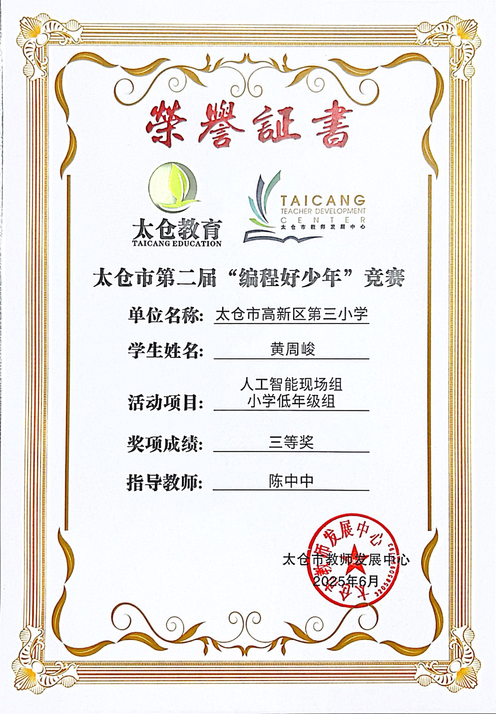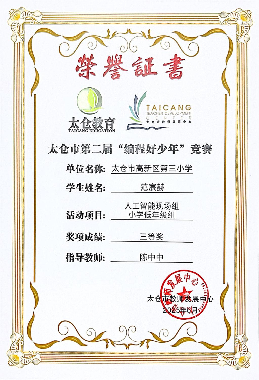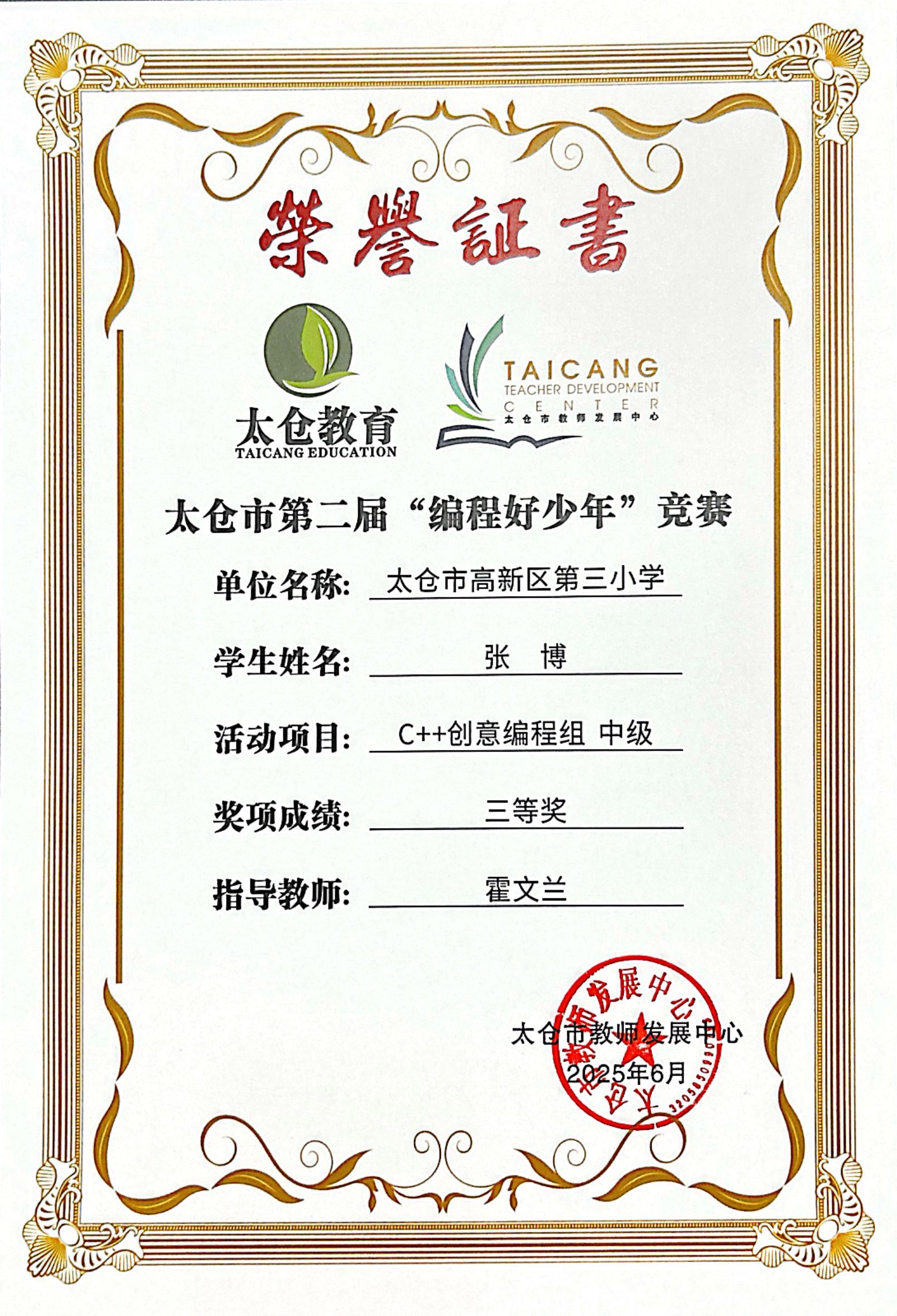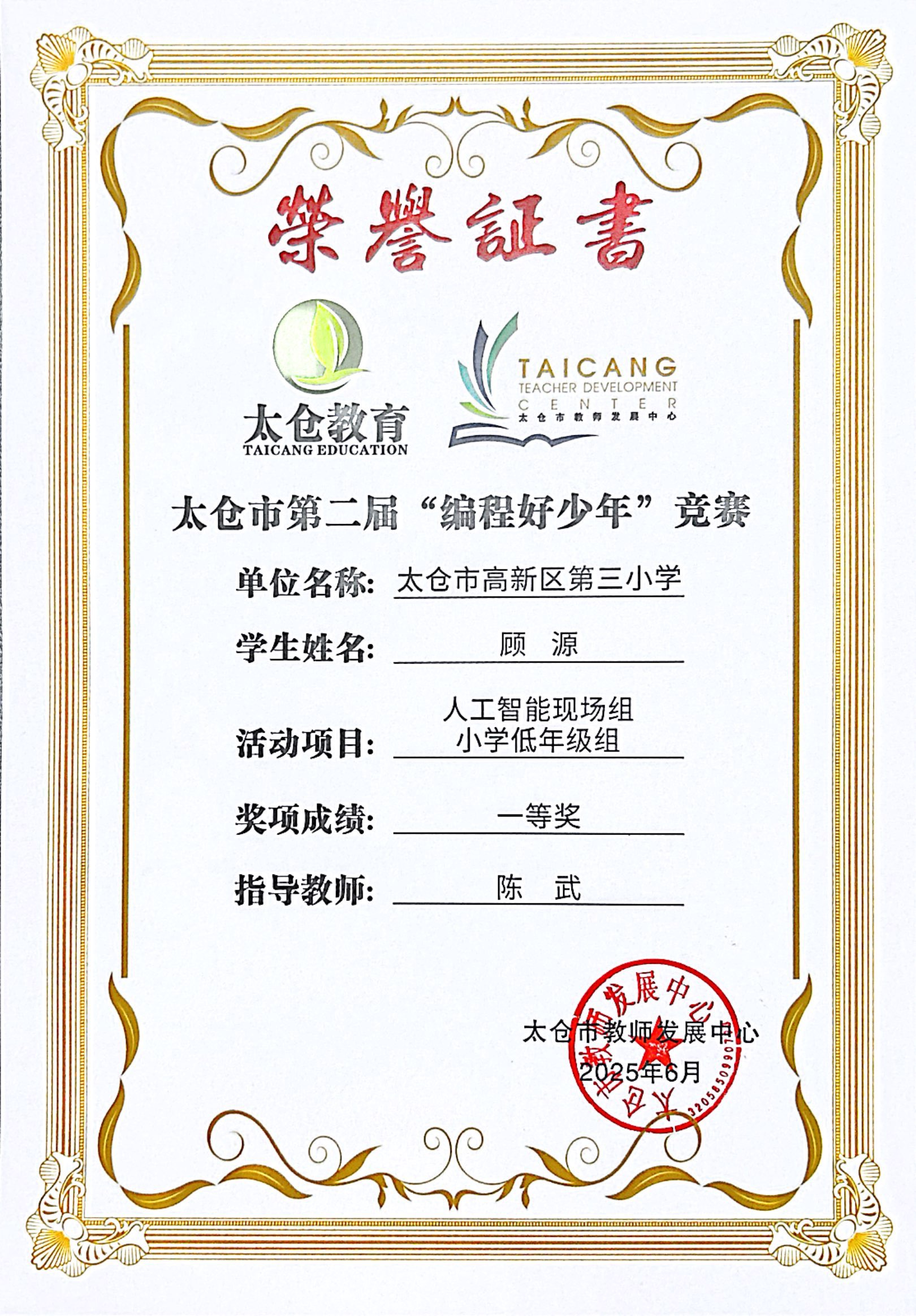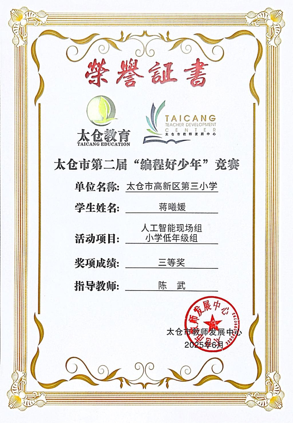 段逸兴、王笑、陈迦美、陈浩睿、凌启宸、刘夏叡、李宥禛、杜铭洋、祁可欣、朱辰悦、李依诺等同学在太仓市第二届“编程好少年”活动中获奖。