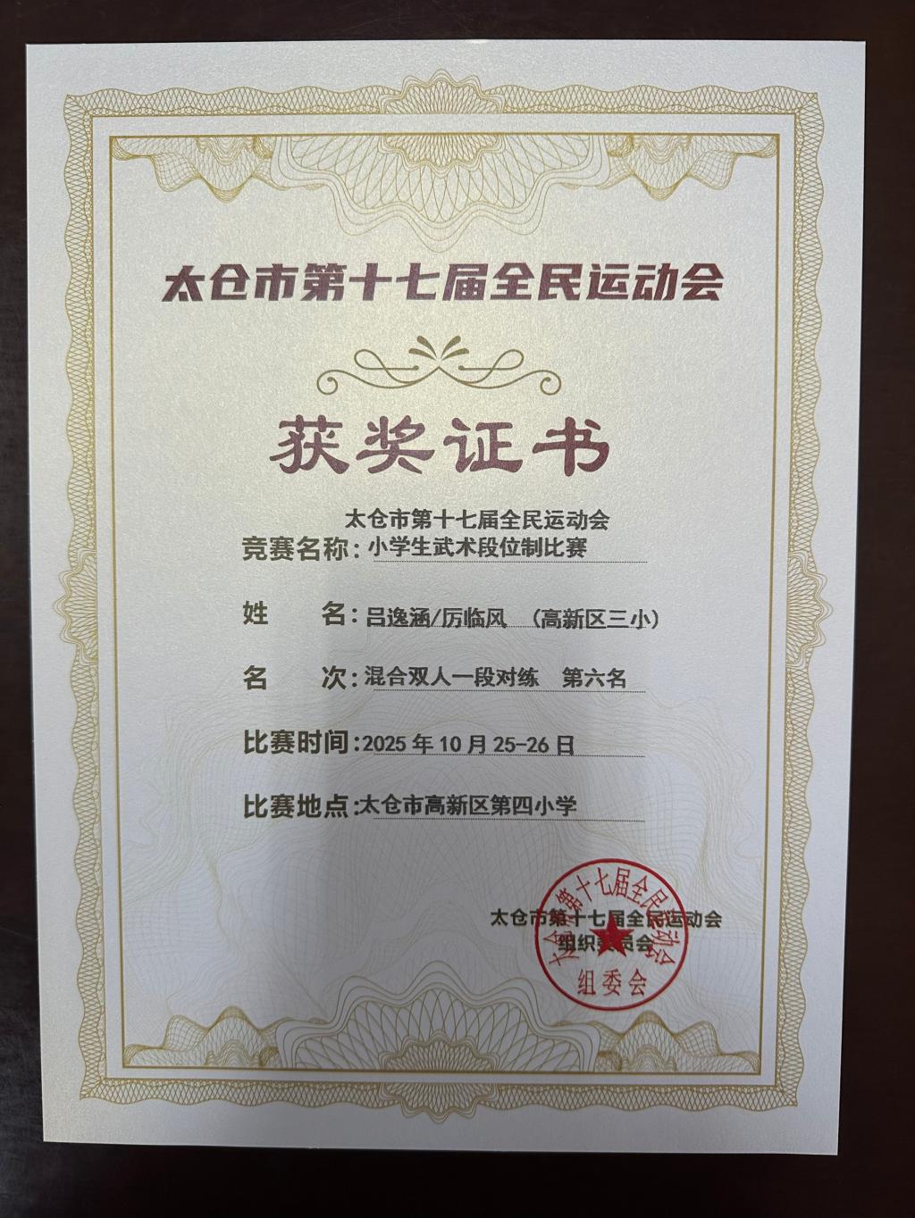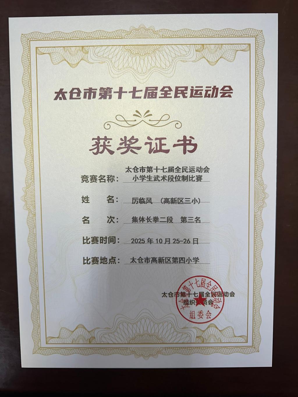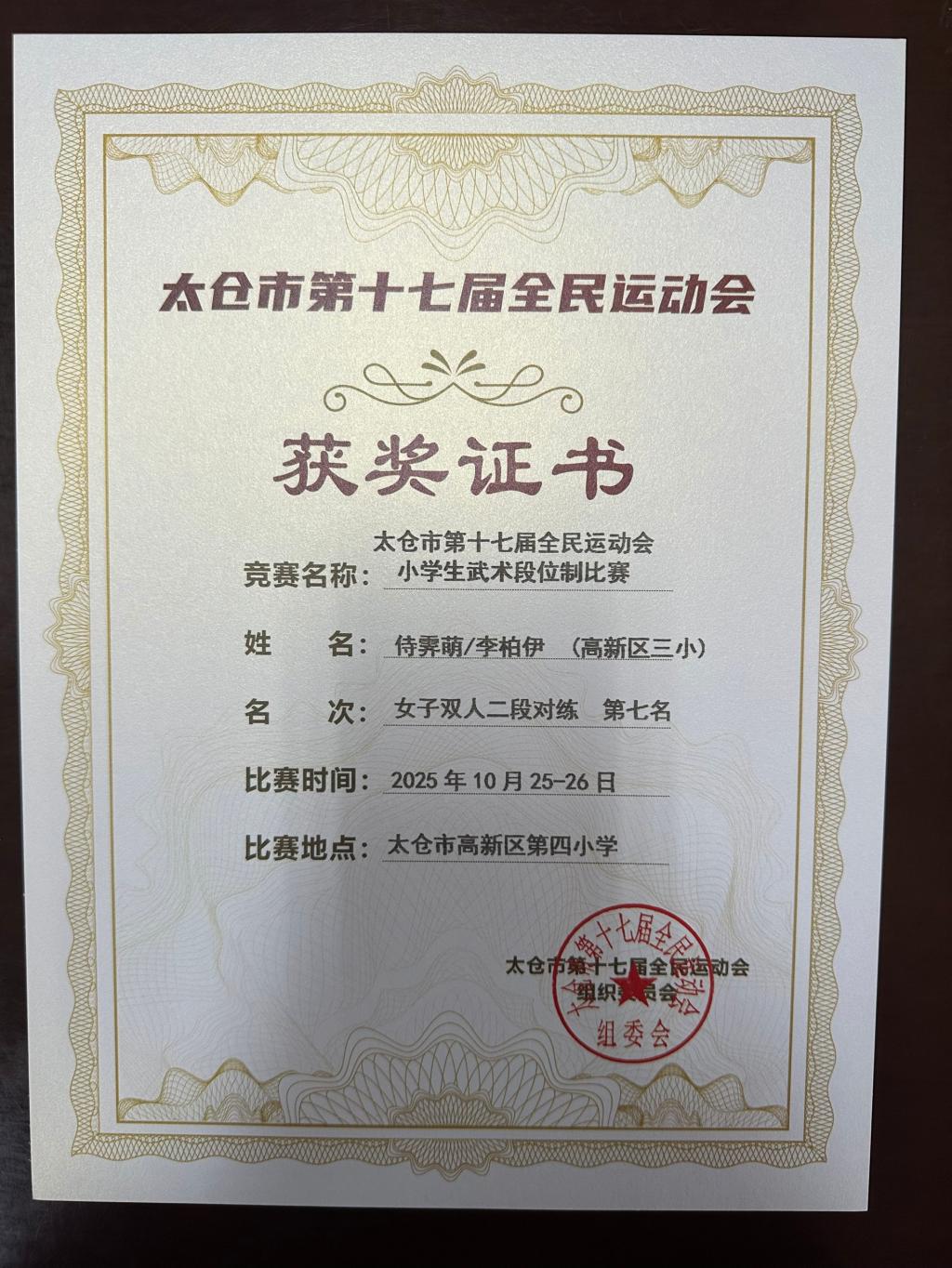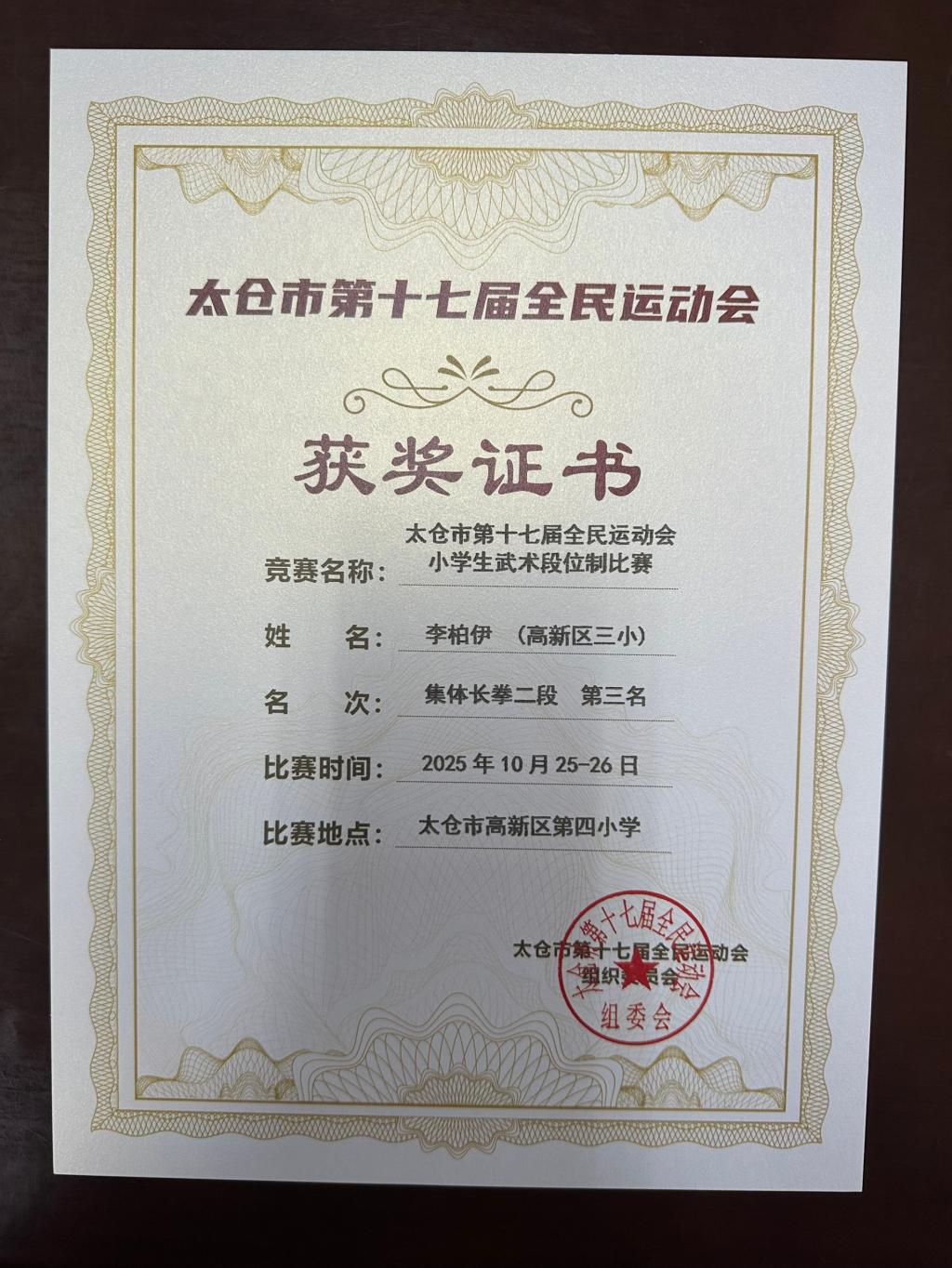 刘佳沐、张书妍、侍霁萌、李柏伊、李一梦、吕逸涵、丁子岚、厉临风、施凌萱、钱陆煜、后睿霖、韩沐汐、许梓馨、许梓彤、金黄萱、曹璟萱、谢婉清、周禹岐同学在太仓市2025年中小学生武术段位制比赛中获奖。