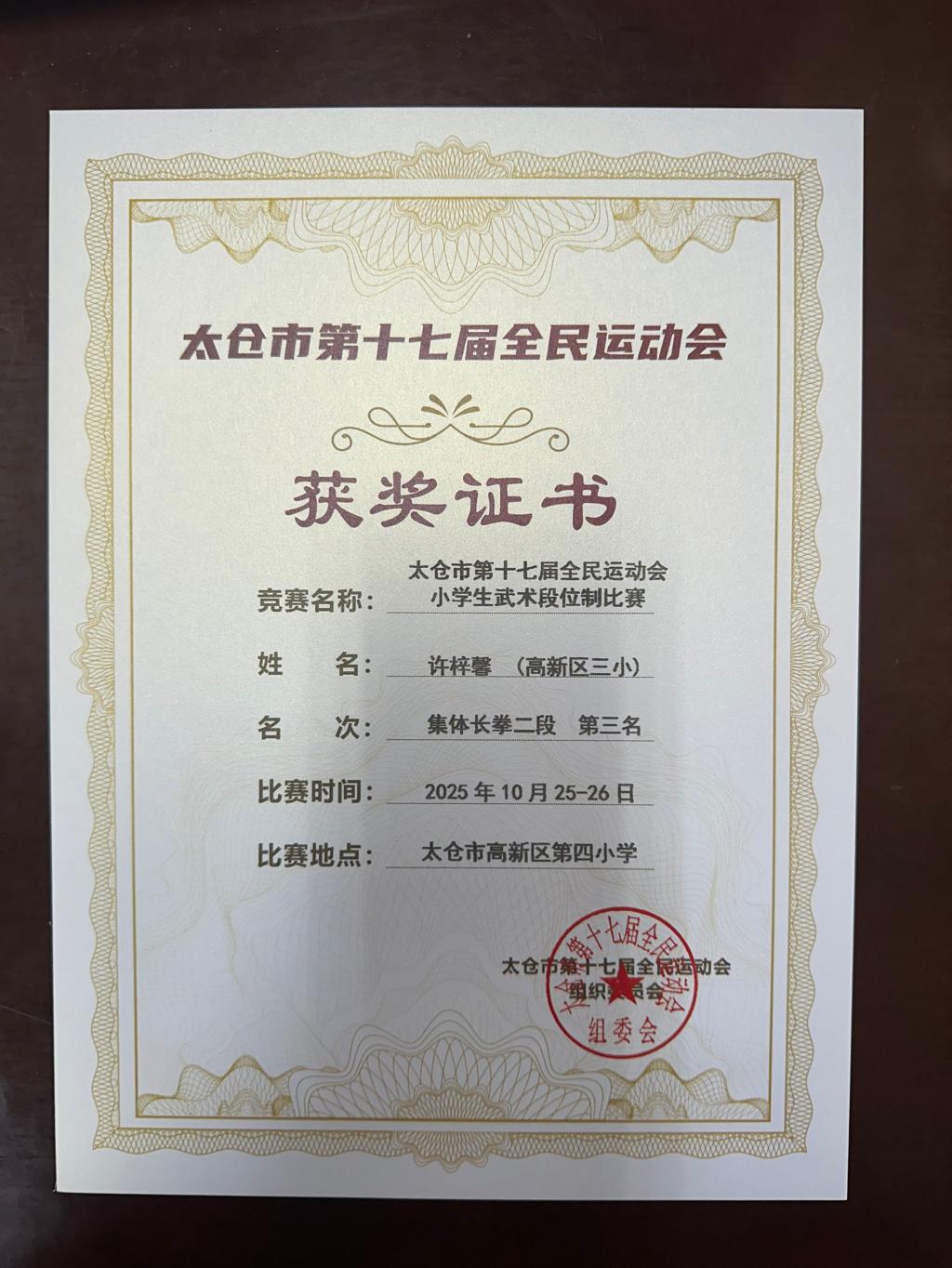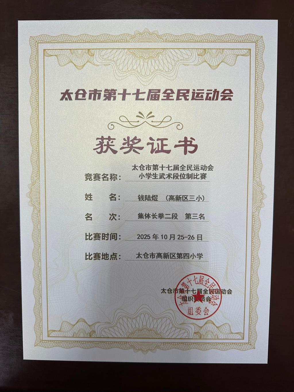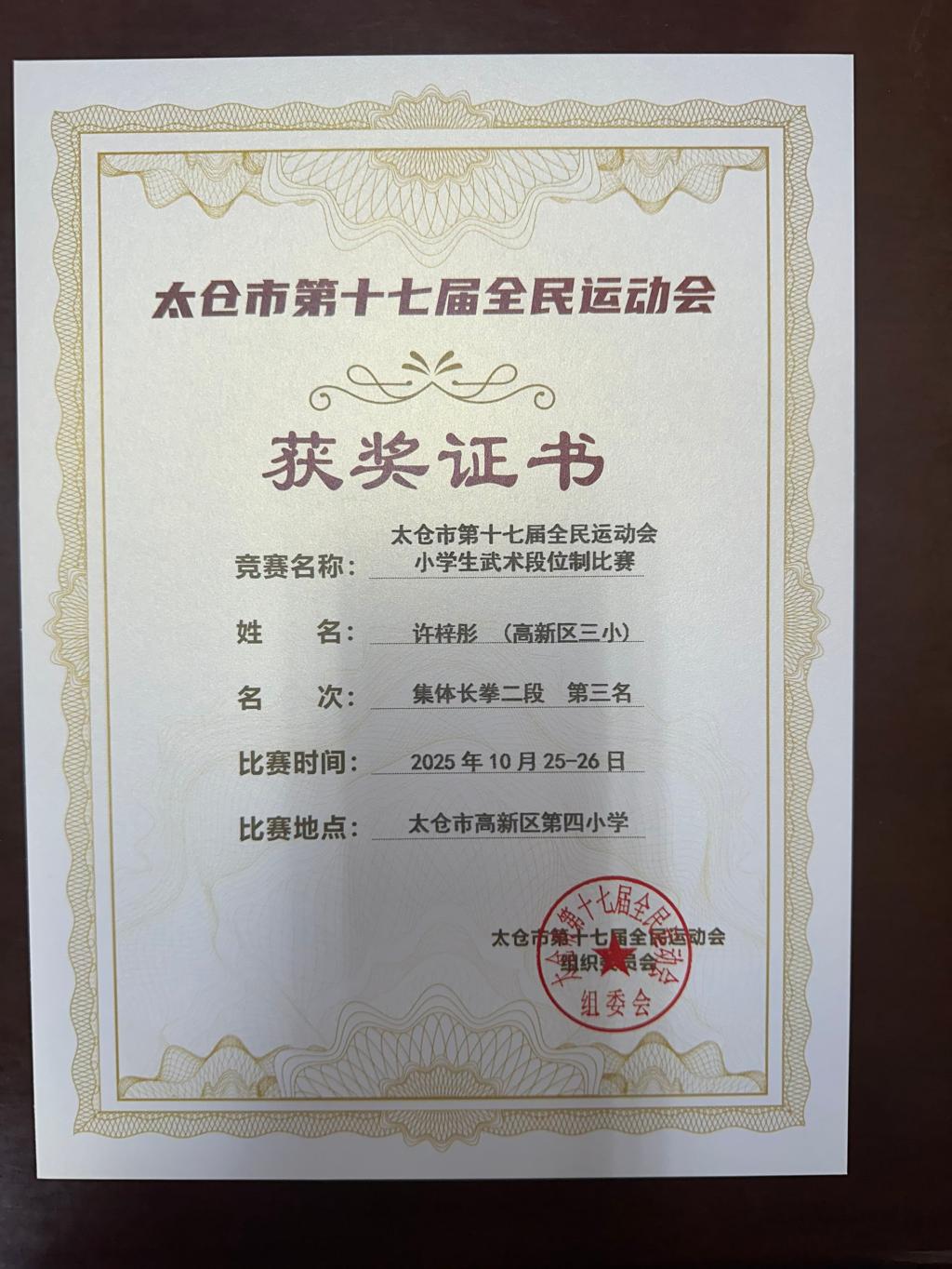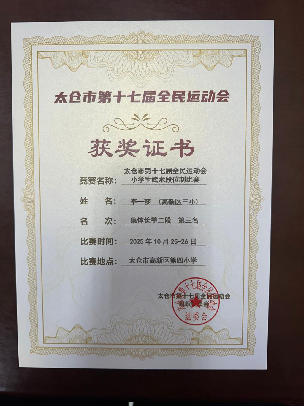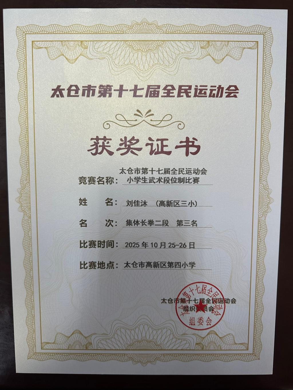 刘佳沐、张书妍、侍霁萌、李柏伊、李一梦、吕逸涵、丁子岚、厉临风、施凌萱、钱陆煜、后睿霖、韩沐汐、许梓馨、许梓彤、金黄萱、曹璟萱、谢婉清、周禹岐同学在太仓市2025年中小学生武术段位制比赛中获奖。