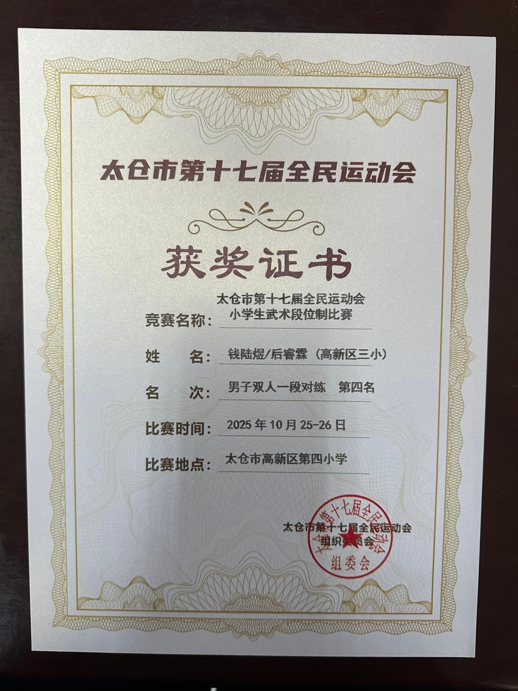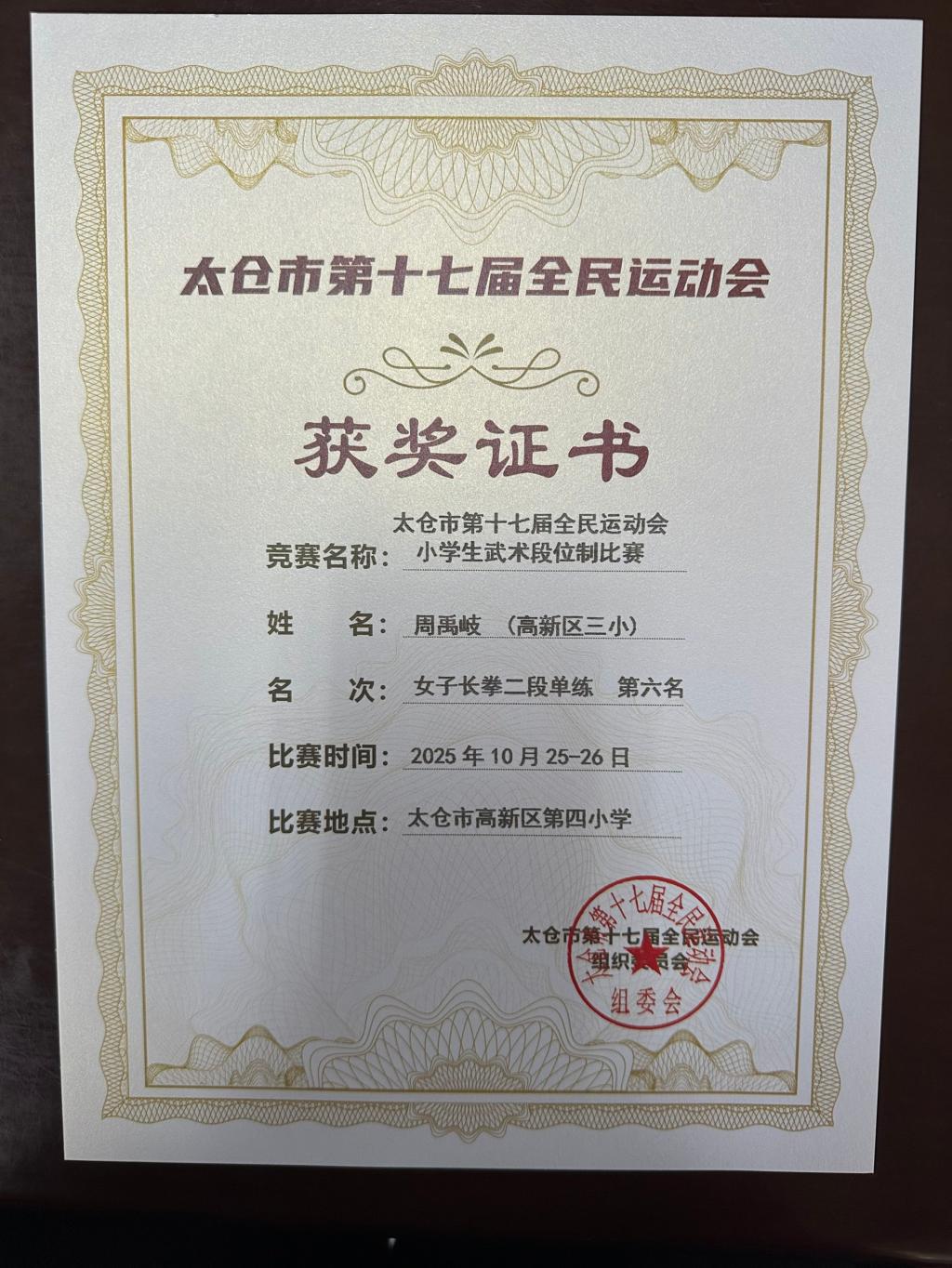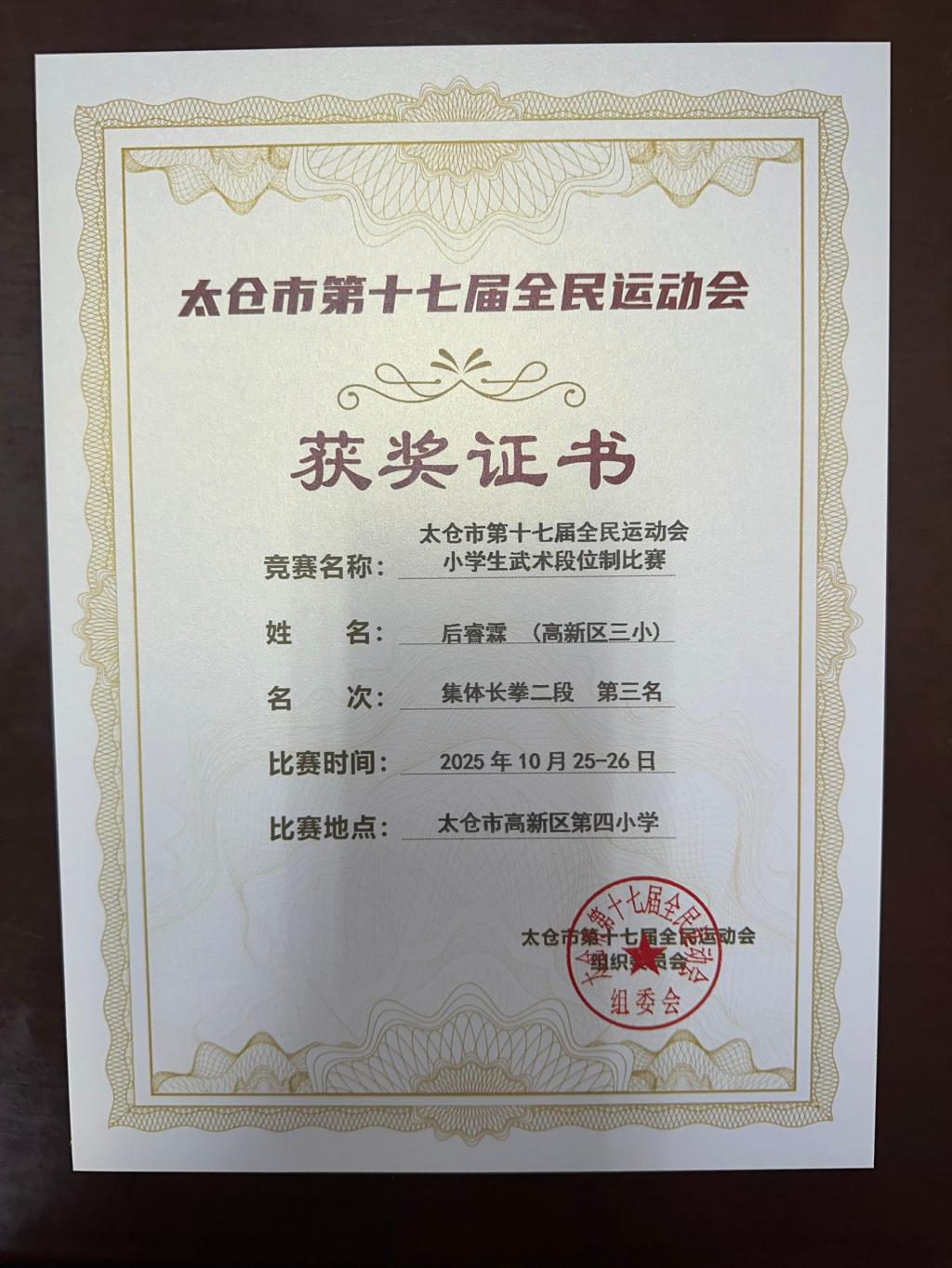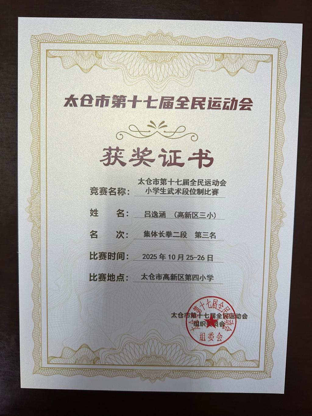 刘佳沐、张书妍、侍霁萌、李柏伊、李一梦、吕逸涵、丁子岚、厉临风、施凌萱、钱陆煜、后睿霖、韩沐汐、许梓馨、许梓彤、金黄萱、曹璟萱、谢婉清、周禹岐同学在太仓市2025年中小学生武术段位制比赛中获奖。