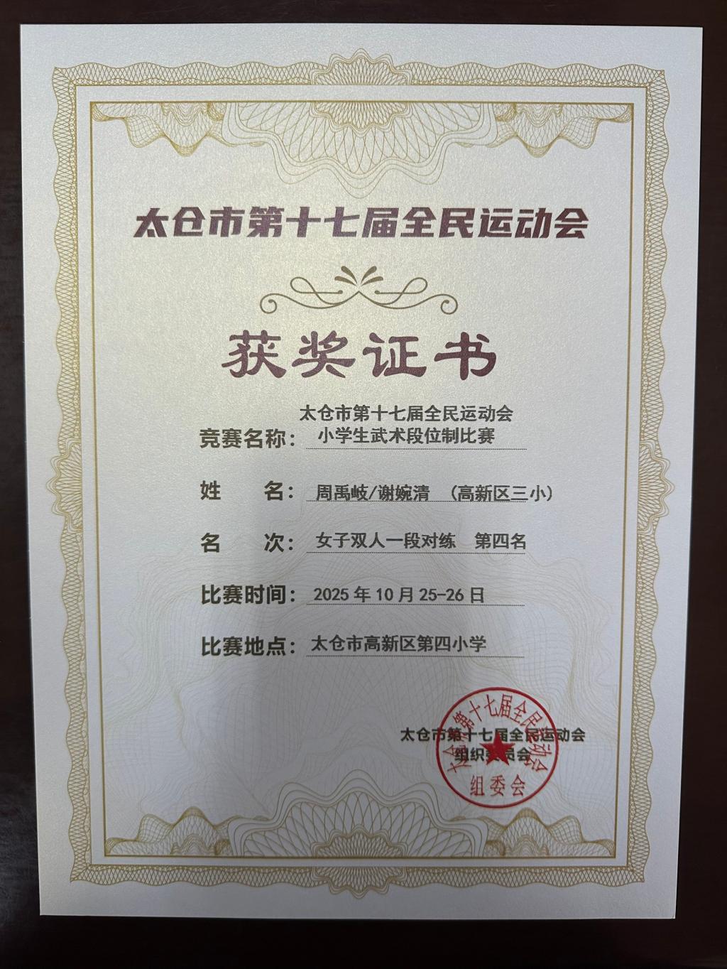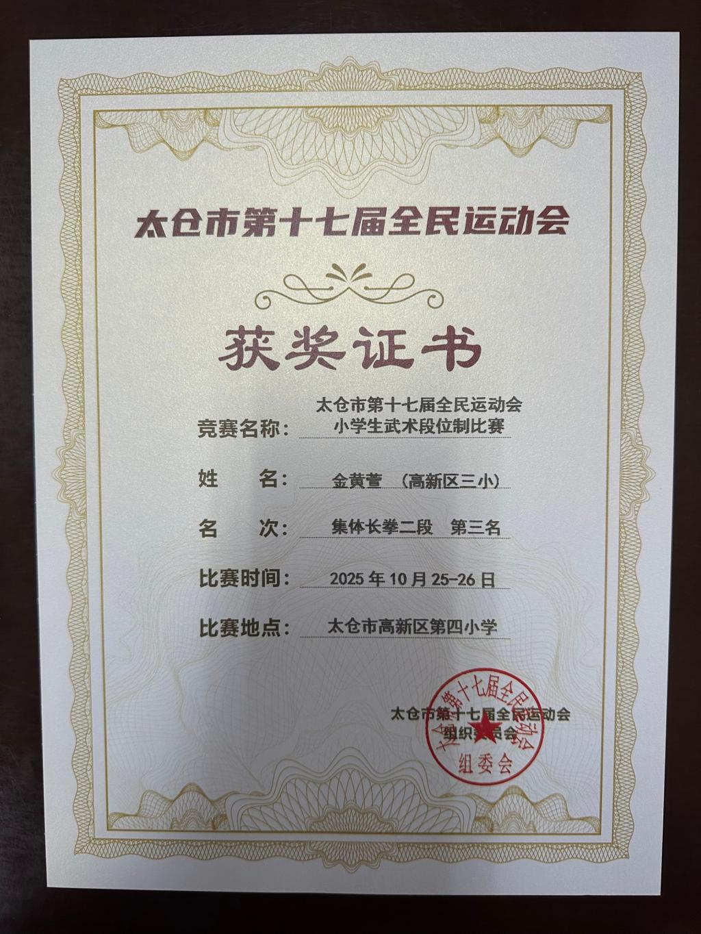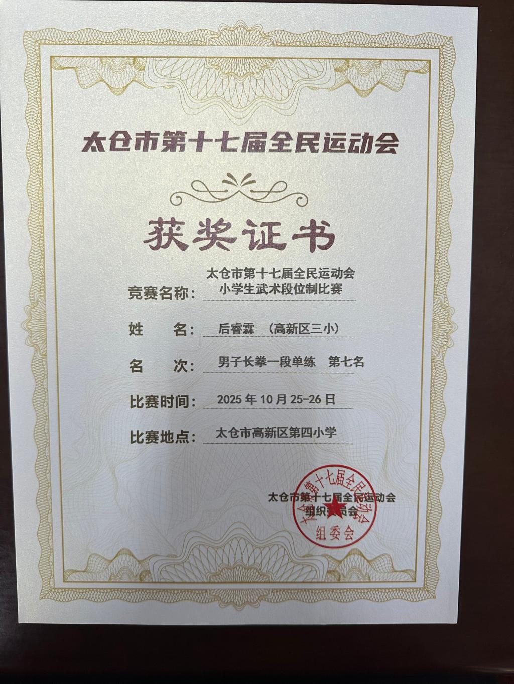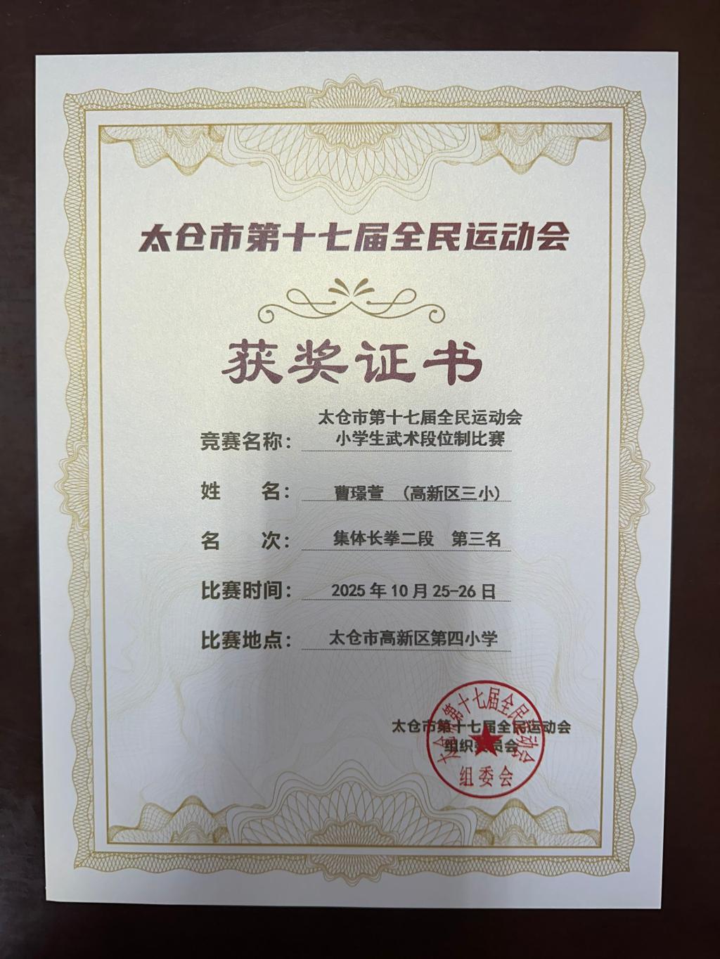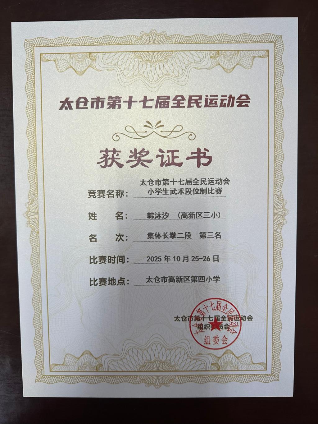 刘佳沐、张书妍、侍霁萌、李柏伊、李一梦、吕逸涵、丁子岚、厉临风、施凌萱、钱陆煜、后睿霖、韩沐汐、许梓馨、许梓彤、金黄萱、曹璟萱、谢婉清、周禹岐同学在太仓市2025年中小学生武术段位制比赛中获奖。