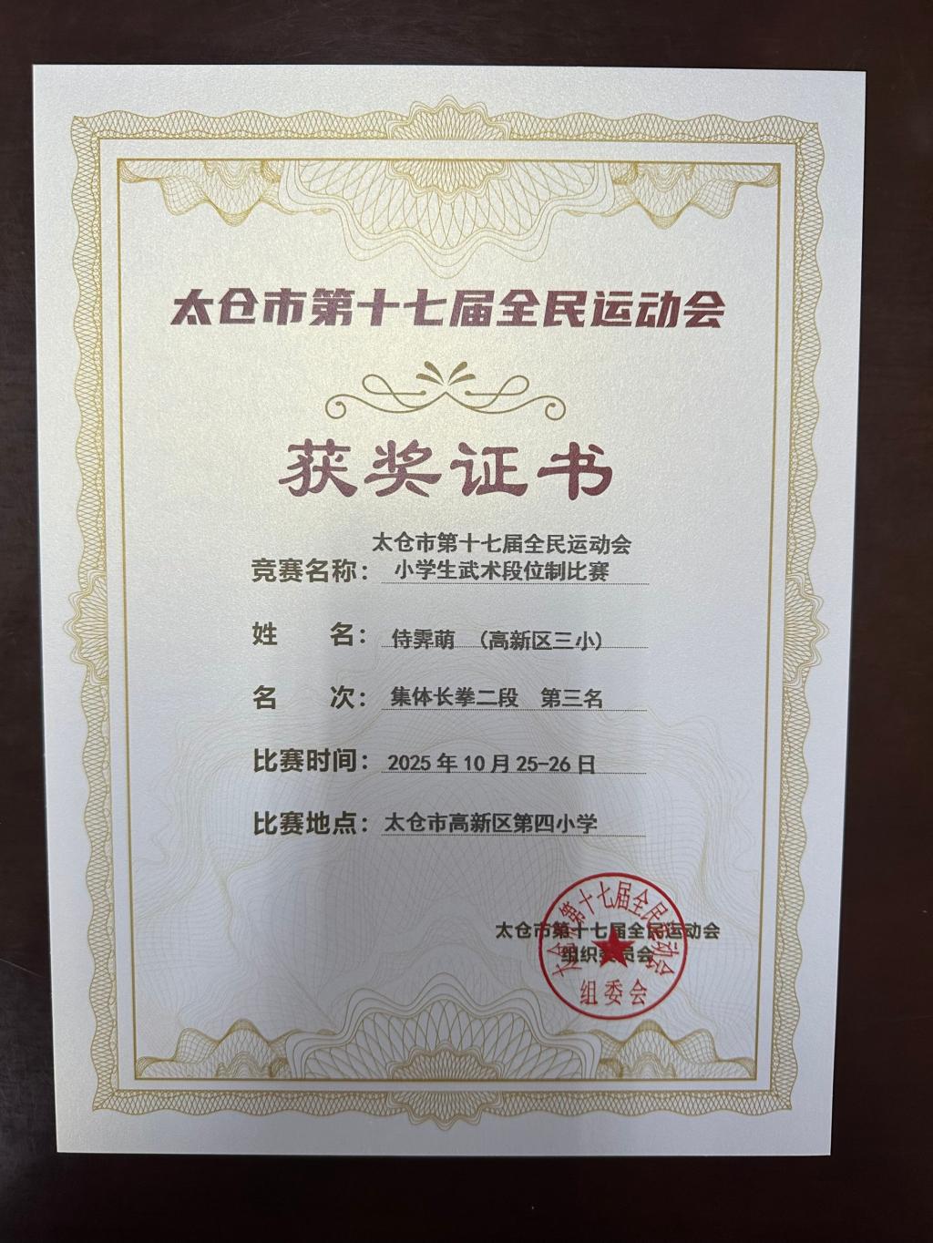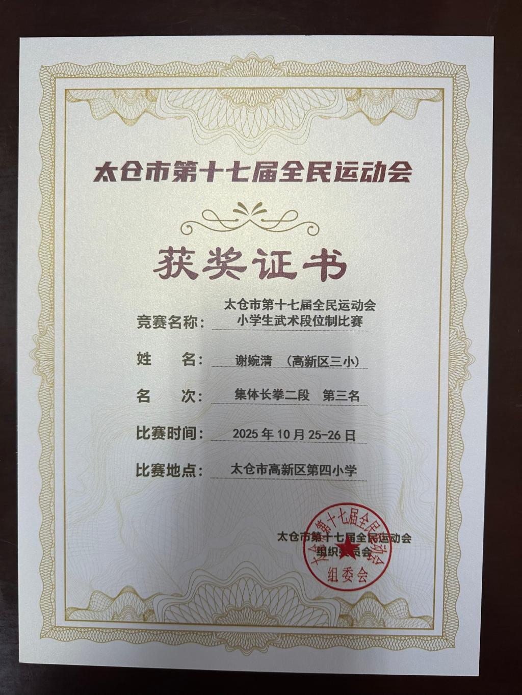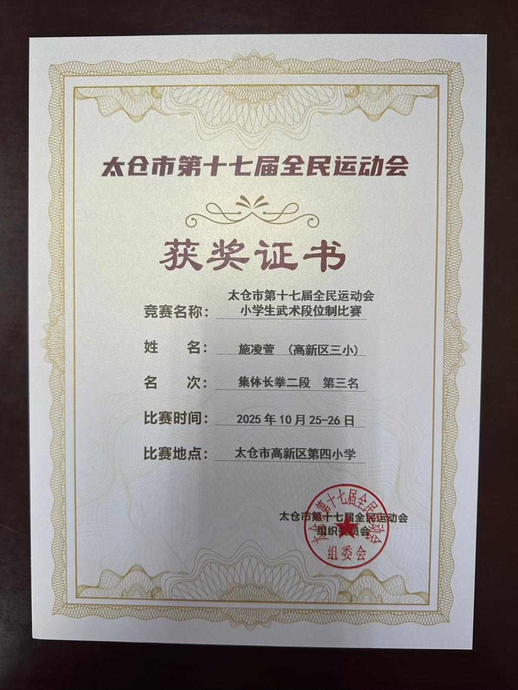 我校荣获太仓市2025年中小学生武术段位制比赛集体长拳二段 第三名。