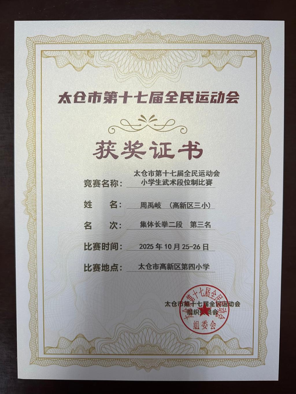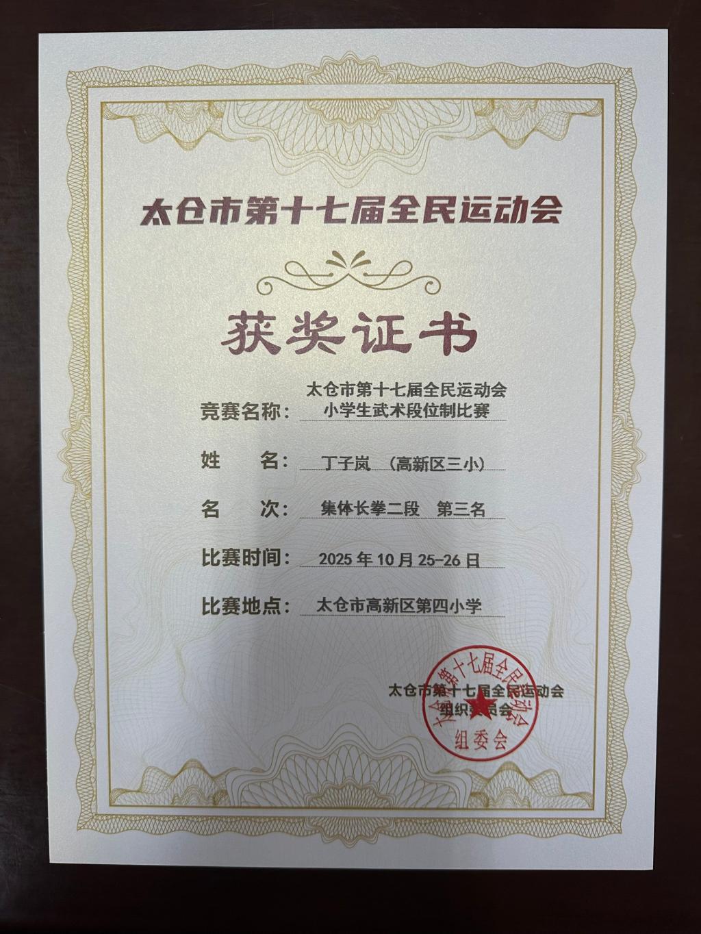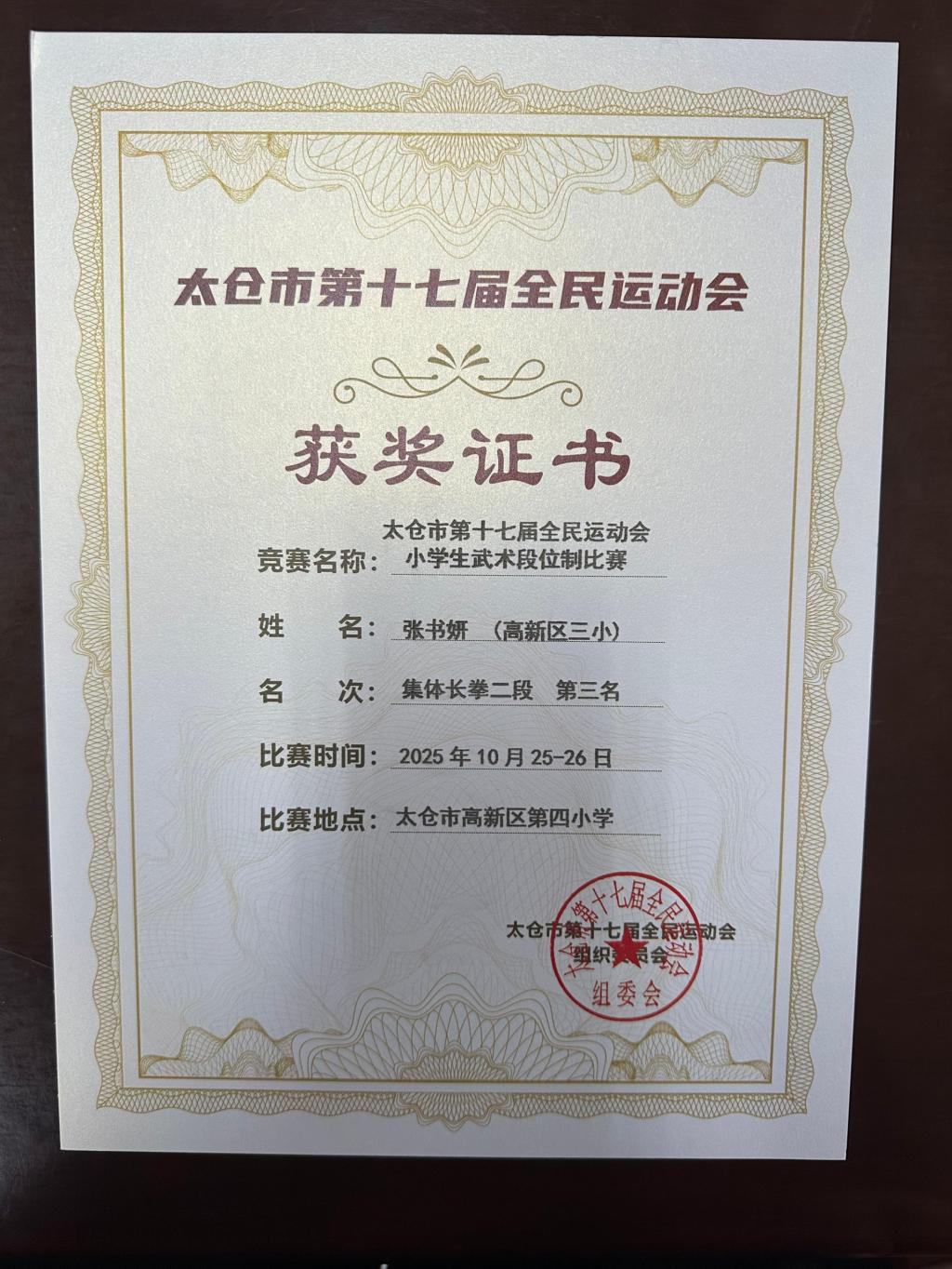 我校荣获太仓市2025年中小学生武术段位制比赛集体长拳二段 第三名。