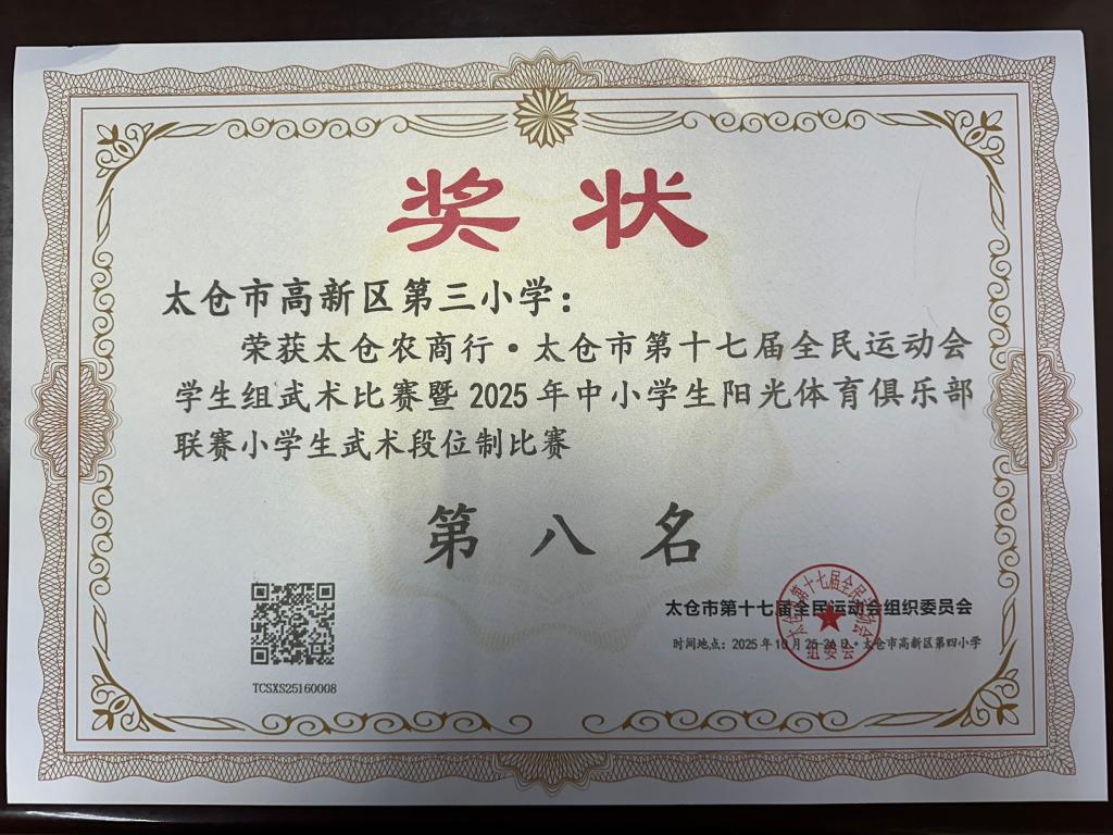 我校荣获太仓市2025年中小学生武术段位制比赛集体长拳二段 第三名。