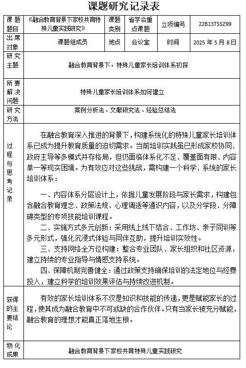 2025年5月8日,“融合教育背景下家校共育特殊儿童实践研究”课题小组成员在墨香三楼会议室进行了研讨。本次课题活动的形式为理论研讨,研究主题为:融合教育背景下,特殊儿童家长培训体系初探,所要解决的问题是:“特殊儿童家长培训体系如何建立?”
