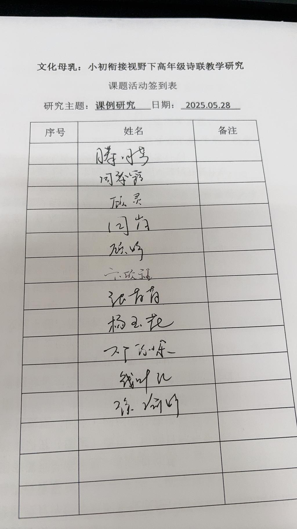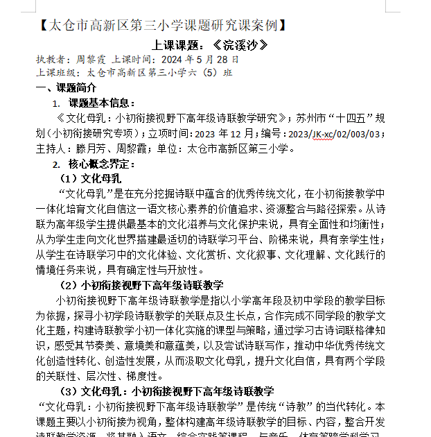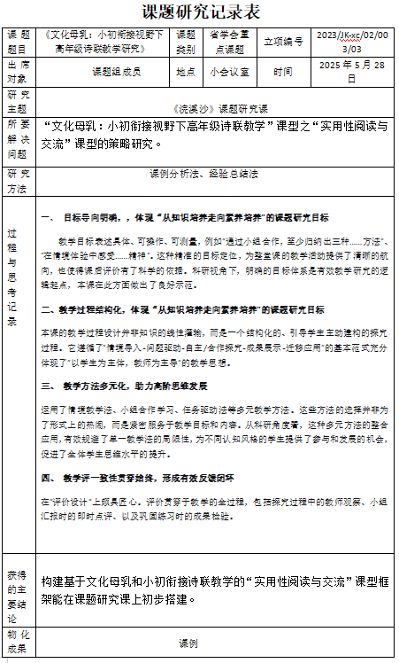 2025年5月28日,“文化母乳:小初衔接视野下高年级诗联教学研究”课题小组成员在小会议室进行了活动。本次周黎霞教课题研究课《竹石》,随后课题组内老师围绕主题“文化母乳:‘小初衔接视野下高年级诗联教学’课型之‘实用性阅读与交流’课型的策略研究”进行了研讨。