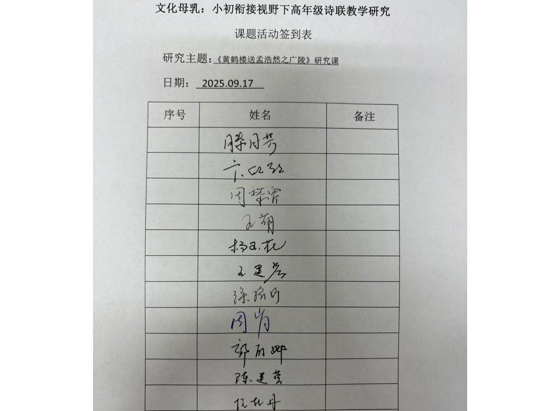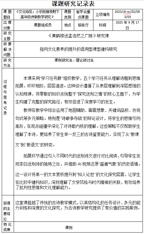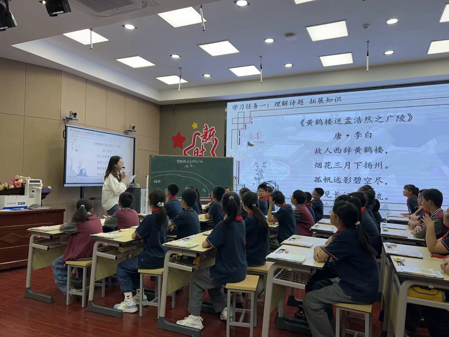 2025年9月17日,“文化母乳:小初衔接视野下高年级诗联教学研究”课题小组成员在报告厅进行了活动。本次卞欣程执教《黄鹤楼送孟浩然之广陵》课题探究课,随后课题组内老师进行了研讨。这堂课超越了传统的古诗教学模式,以其结构化的任务设计、多元的能力训练和深度的文化探究,为古诗教学研究提供了有价值的实践案例。