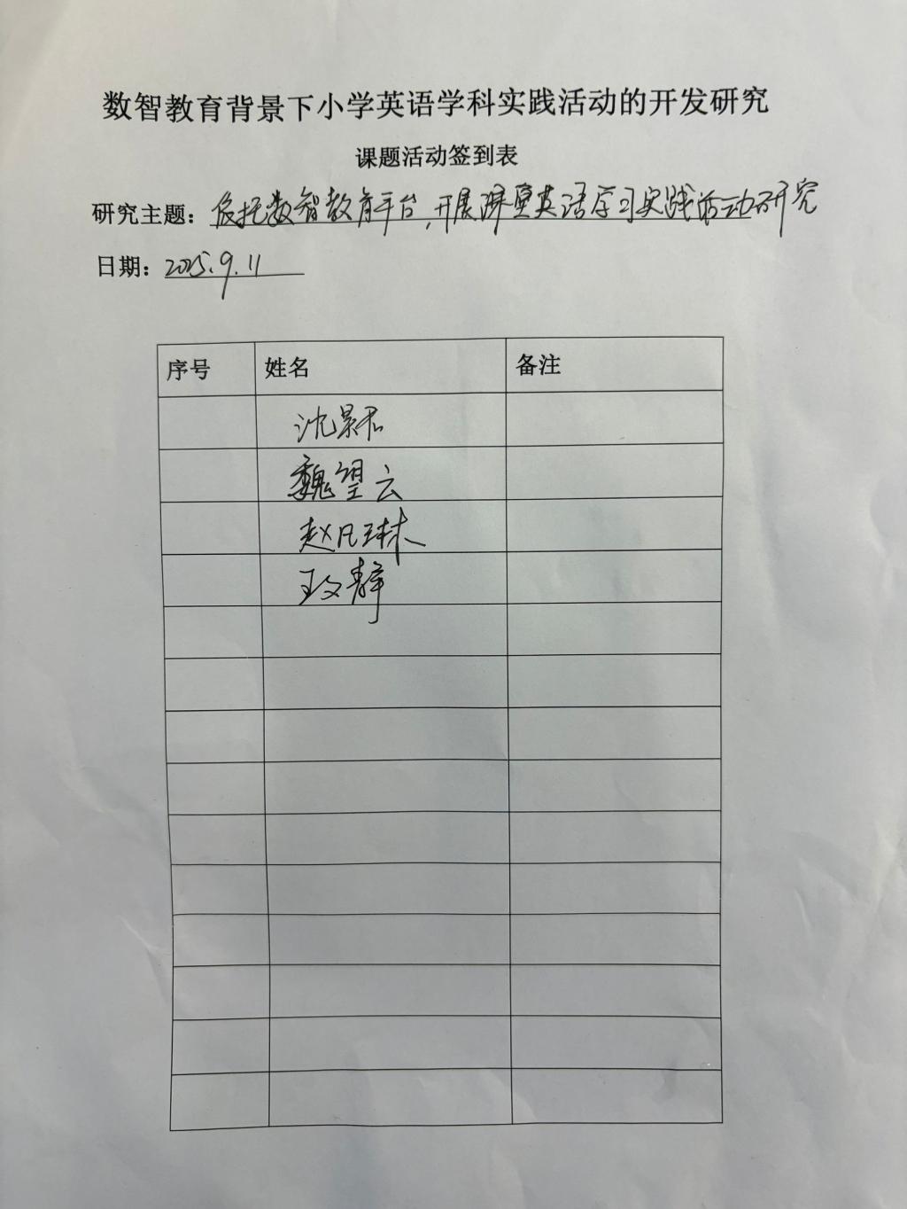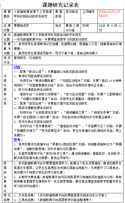 2025年9月11日,“数智教育背景下小学英语学科实践活动的开发研究”课题小组成员在墨香三楼会议室进行了研讨。本次课题活动的形式为理论研讨,研究主题为依托数智教育平台,开展课堂英语学习实践活动研究。所要解决两方面问题,一个是低学段学生英语单词记忆枯燥、发音易出错、语感输入不足;另一个是高学段学生英语读写脱节、写作不敢下笔、语言运用场景少。