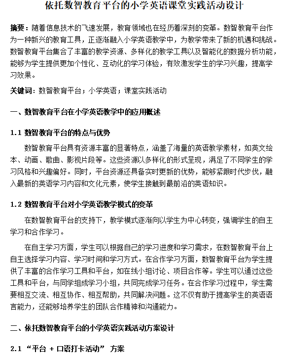 通过开展相应的实践活动,我们总结出,依托数智教育平台开展课堂英语学习,能通过个性化资源推送,精准匹配学生英语水平差异,让学生在高频互动中强化语言运用能力,尤其提升了口语表达,有效提升不同层次学生的学习参与度。 从教学效果来看,数智教育平台可实现英语学习数据的实时追踪与分析,帮助教师精准掌握学生薄弱环节,优化教学策略,最终推动课堂英语教学质量与学生学习成效双向提升。