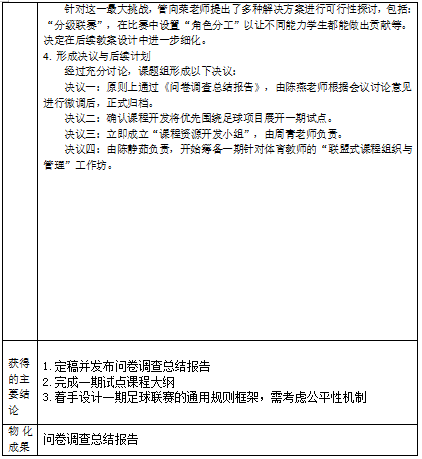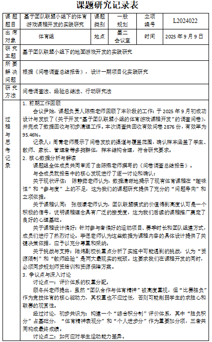2025年9月9日,“基于团队联盟小组下的体育游戏课程开发的实践研究”课题小组成员在墨香二楼会议室进行了课题研讨。本次研讨主要是根据《问卷调查总结报告》,设计一期足球联赛的通用框架,在比赛中设置“角色分工”,以让不同能力学生都能做出贡献等。