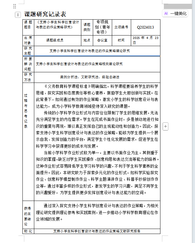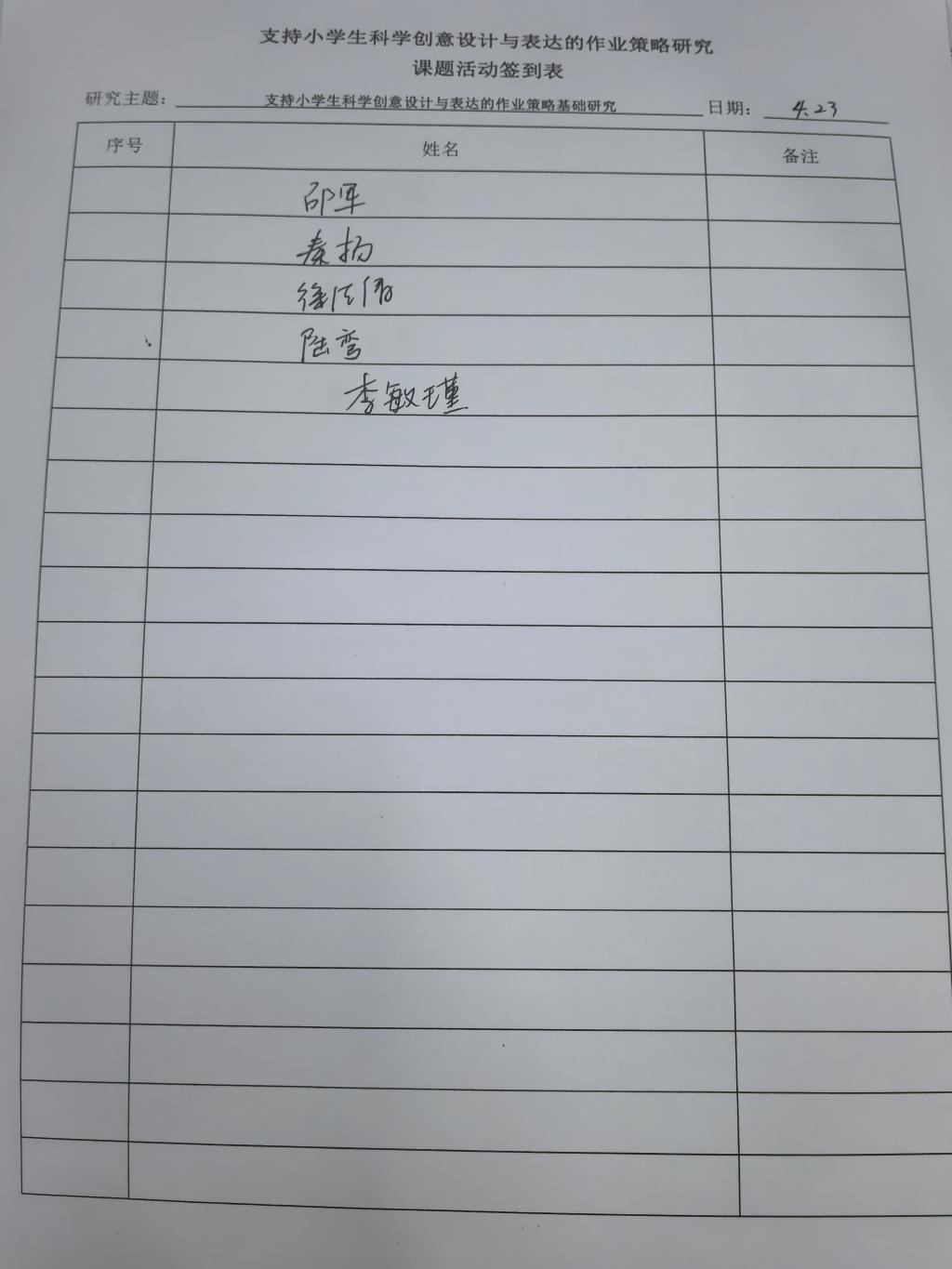 2025年4月23日,“支持小学生科学创意设计与表达的作业策略研究”课题小组成员在墨香二楼会议室进行了研讨。本次课题活动的形式为理论研讨,本次课题活动的形式为理论研讨,研究主题为支持小学生科学创意设计与表达的作业策略基础研究。