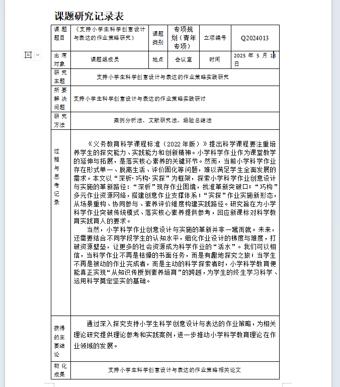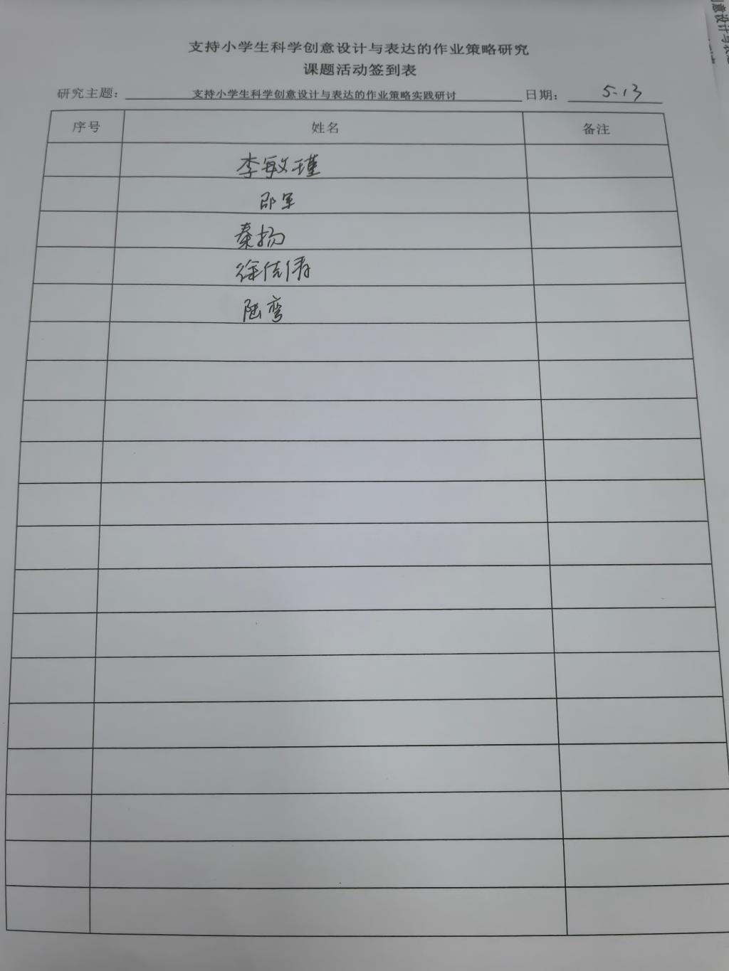 2025年5月13日,“支持小学生科学创意设计与表达的作业策略研究”课题小组成员在墨香二楼会议室进行了研讨。本次课题活动的形式为理论研讨,本次课题活动的形式为实践研讨,研究主题为支持小学生科学创意设计与表达的作业策略实践研讨。
