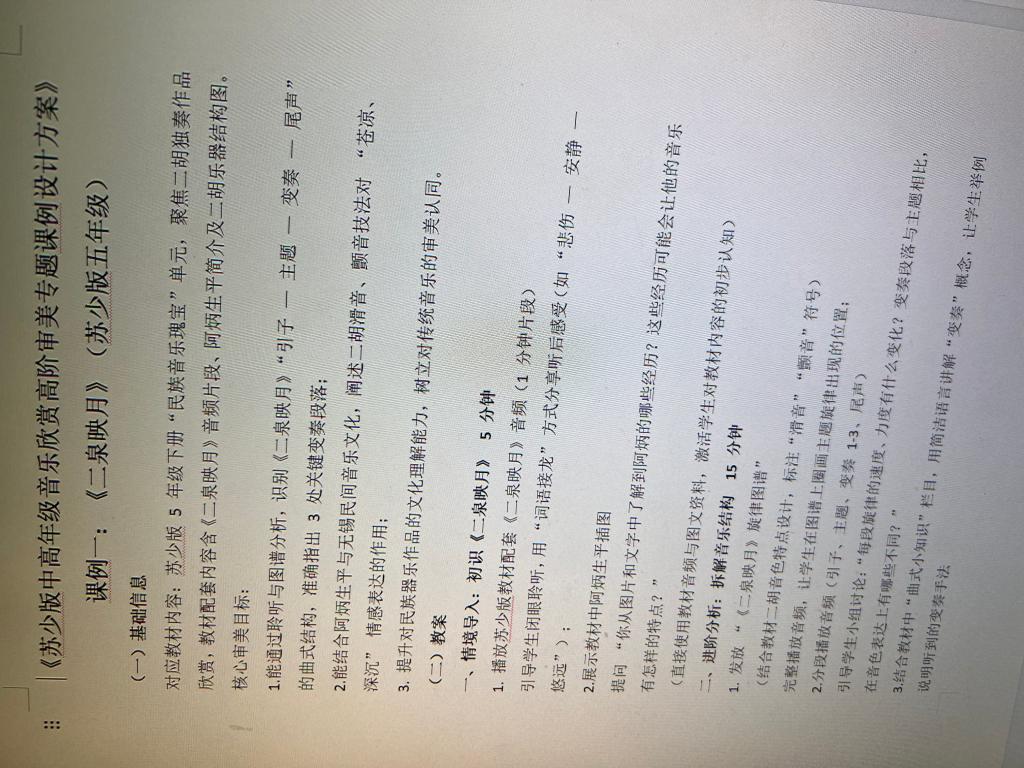 课例开发阶段,选取《二泉映月》《蓝色多瑙河》开发专题课例,均设计 “基础感知 — 进阶分析 — 文化联结” 环节。前者借助旋律图谱拆解结构,结合阿炳生平拓展文化;后者以三拍子节奏感知为基础,通过表格分析曲式,补充维也纳新年音乐会视频解读文化。