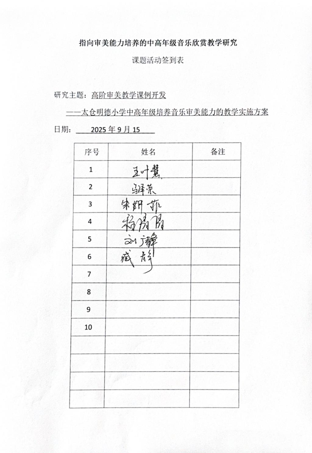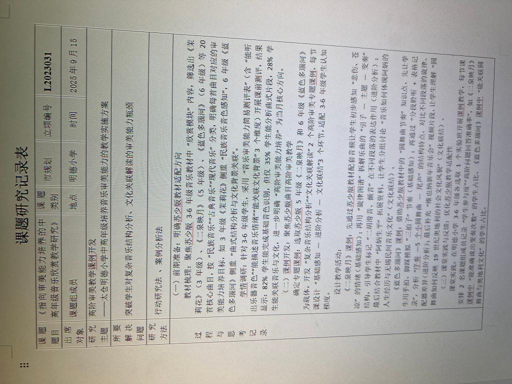 2025年9月15日,课题组成员在明德小学科学教室1开展以 “高阶审美教学课例开发” 为主题的课题活动,聚焦苏少版中高年级音乐教材,旨在突破学生复杂音乐结构分析、文化关联解读的审美能力瓶颈,采用行动研究法与案例分析法推进研究。